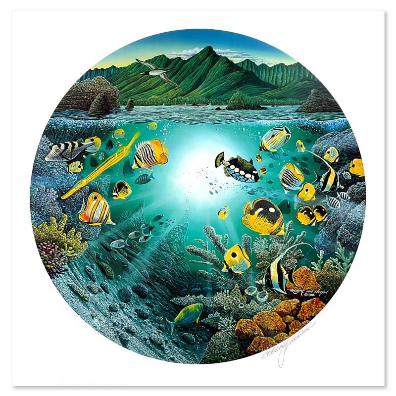 "Menehunes of Hanalei" is a limited edition mixed media on paper by Robert Lyn Nelson, numbered and hand signed by the artist. Includes Letter of Authenticity. Measures approx. 27.5" x 30" (border), 24" (image-diameter). There may be minor imperfections on the paper but the piece is in overall good condition.