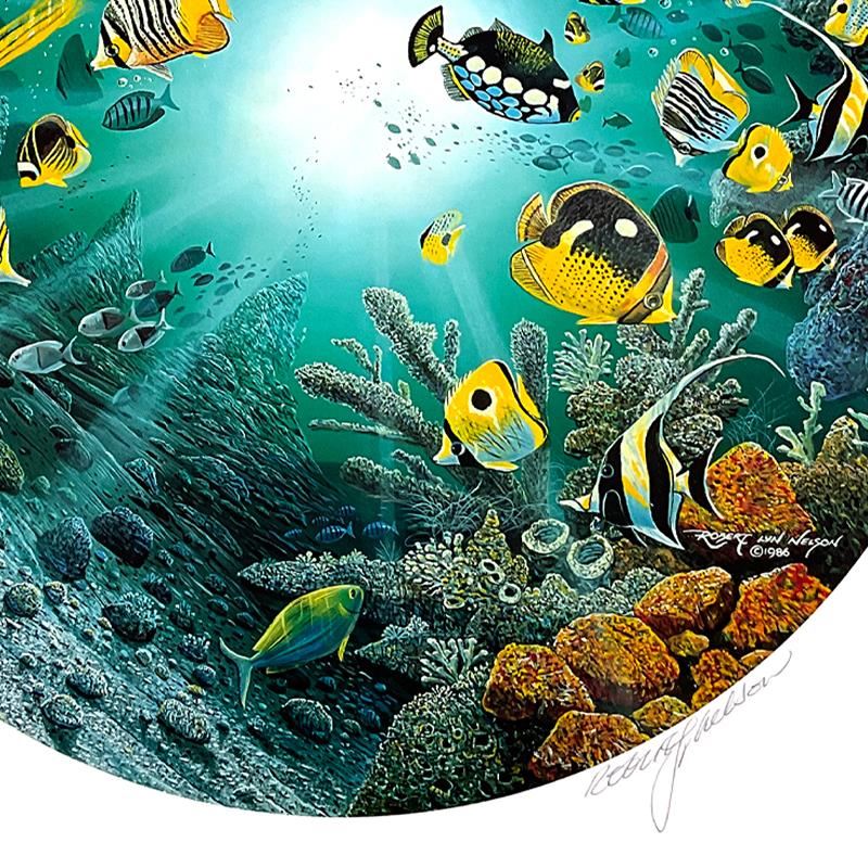 "Menehunes of Hanalei" is a limited edition mixed media on paper by Robert Lyn Nelson, numbered and hand signed by the artist. Includes Letter of Authenticity. Measures approx. 27.5" x 30" (border), 24" (image-diameter). There may be minor imperfections on the paper but the piece is in overall good condition.