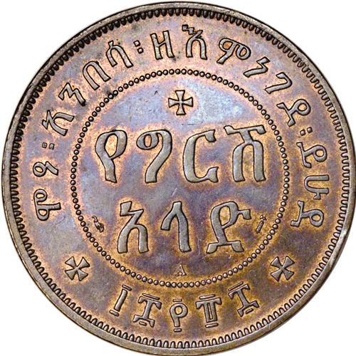<B>Menelik II 1/2 Gersh 1888EE (1896), </B></I>KM7, glossy brown UNC with considerable original luster, especially on the reverse. Very rare type with a total mintage of 200. Struck at the Paris Mint with the "A" mintmark.<BR><I>From the Dennis Ritter Collection</B></I><BR><BR><b>Shipping:</b> Coin/Currency (<a target="_blank" href="http://www.heritageauctions.com/common/shipping.php">view shipping information</a>)