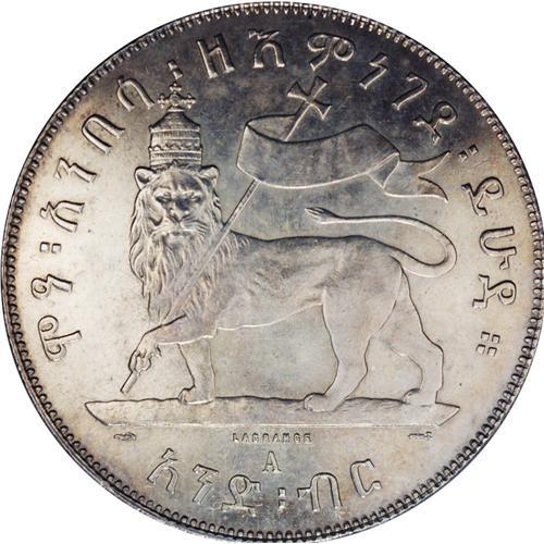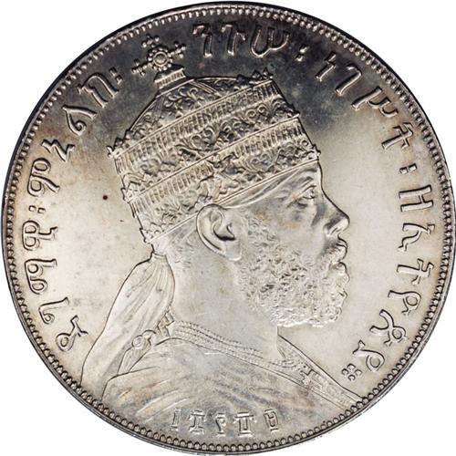 <B>Menelik II Bir 1889EE (1897), </B></I>KM5, Proof, lightly cleaned at one time and now with light golden toning in the legends. The details on this coin are unquestionably superior to business strikes and the surfaces are reflective. This is the first Proof of this date we have recorded, but it not completely unexpected from the Paris Mint.<BR><I>From the Monedas Oro Collection</B></I><BR><BR><b>Shipping:</b> Coin/Currency (<a target="_blank" href="http://www.heritageauctions.com/common/shipping.php">view shipping information</a>)