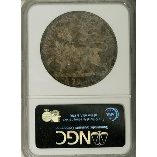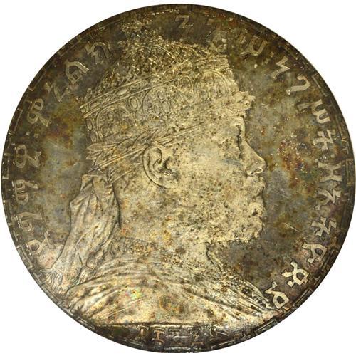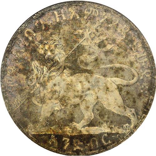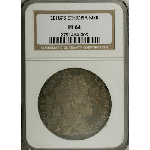 <B>Menelik II Bir 1892EE (1900), </B></I>KM19, Proof 64 NGC, deep multicolored patina, somewhat mottled in part, but an attractive example of this beautiful type. Very rare in Proof. (The holder incorrectly states the date as EE1895.)<BR><BR><b>Shipping:</b> Coin/Currency (<a target="_blank" href="http://www.heritageauctions.com/common/shipping.php">view shipping information</a>)