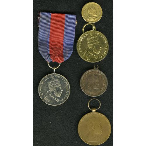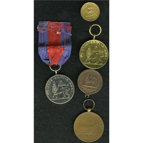 <B>Menelik II - Medals and Decorations, </B></I>an interesting quintet of medallic artifacts of Menelik's reign including: Gill M37, brass medalette dated EE1887 and with the Gersh denomination, nice XF and scarce, Gill M36, two examples, one brass and one nickel-plated brass, bust of Menelik II with the Lion of Judah reverse, both are AU and looped as made, the plated example has an attached blue and red ribbon, Gill M41 brass medal for the railway between Djibouti and Addis Ababa, nice AU, tiny spot, EE1895 (1903), and a worn copper medalatte similar to M37 with date EE1887 and Gersh denomination. <B>Sold as is, no return lot.</B></I><BR><I>From the Dennis Ritter Collection</B></I><BR><BR><b>Shipping:</b> Coin/Currency (<a target="_blank" href="http://www.heritageauctions.com/common/shipping.php">view shipping information</a>)