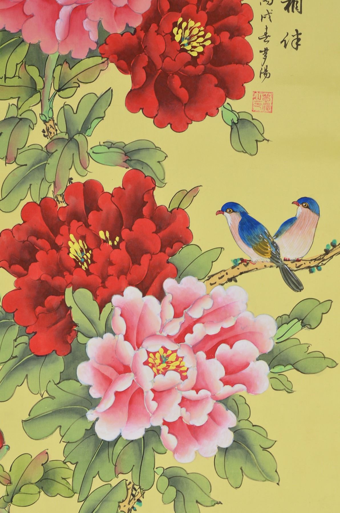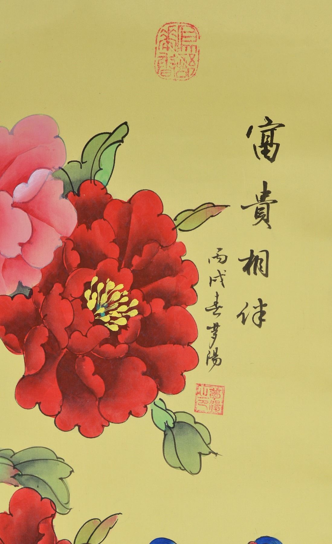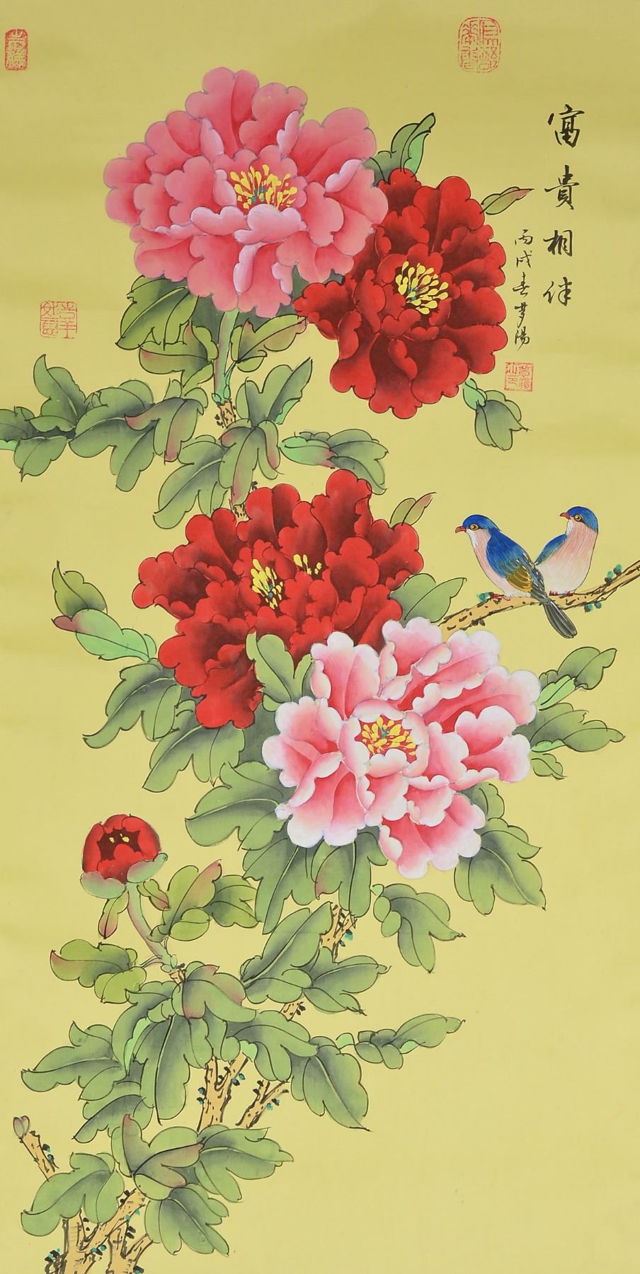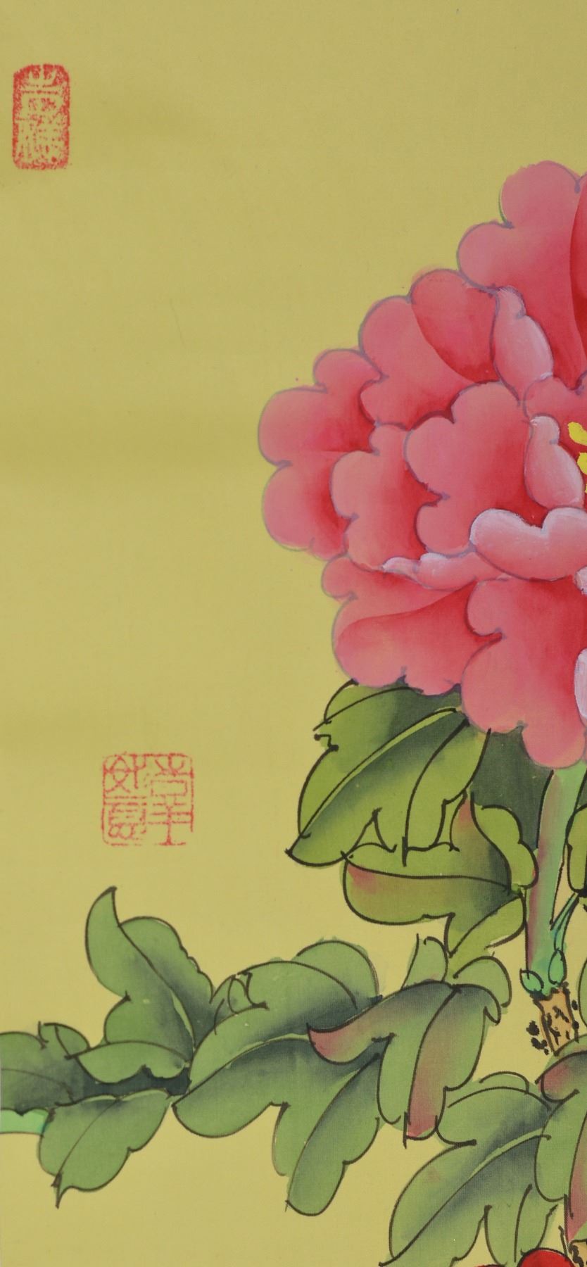 Ink and watercolor on paper, hanging scroll. Featuring peonies. Attributed to Meng Tang (Chinese, 20th century) and inscribed with four artist seals. 89 x 44.5 cm