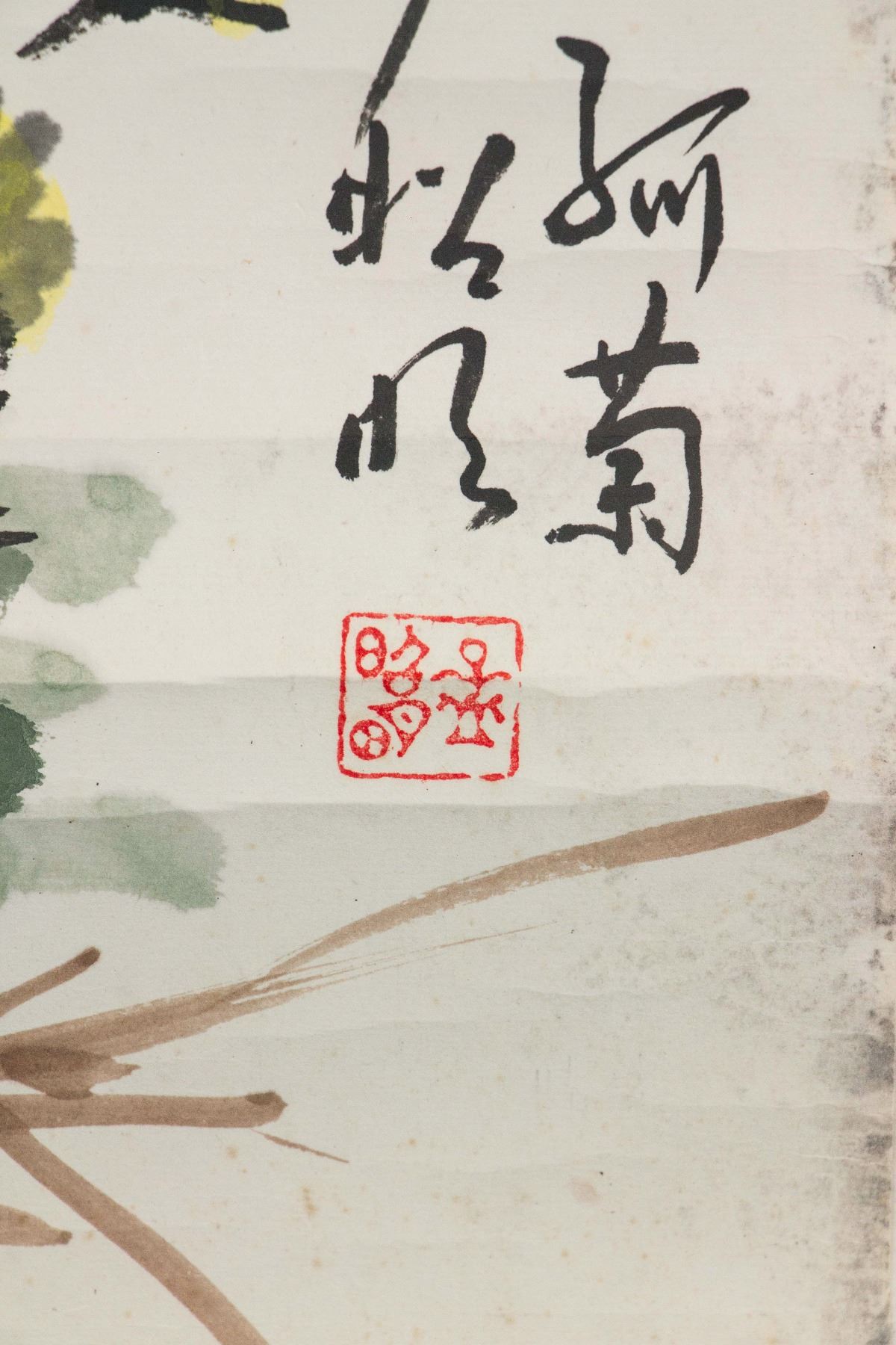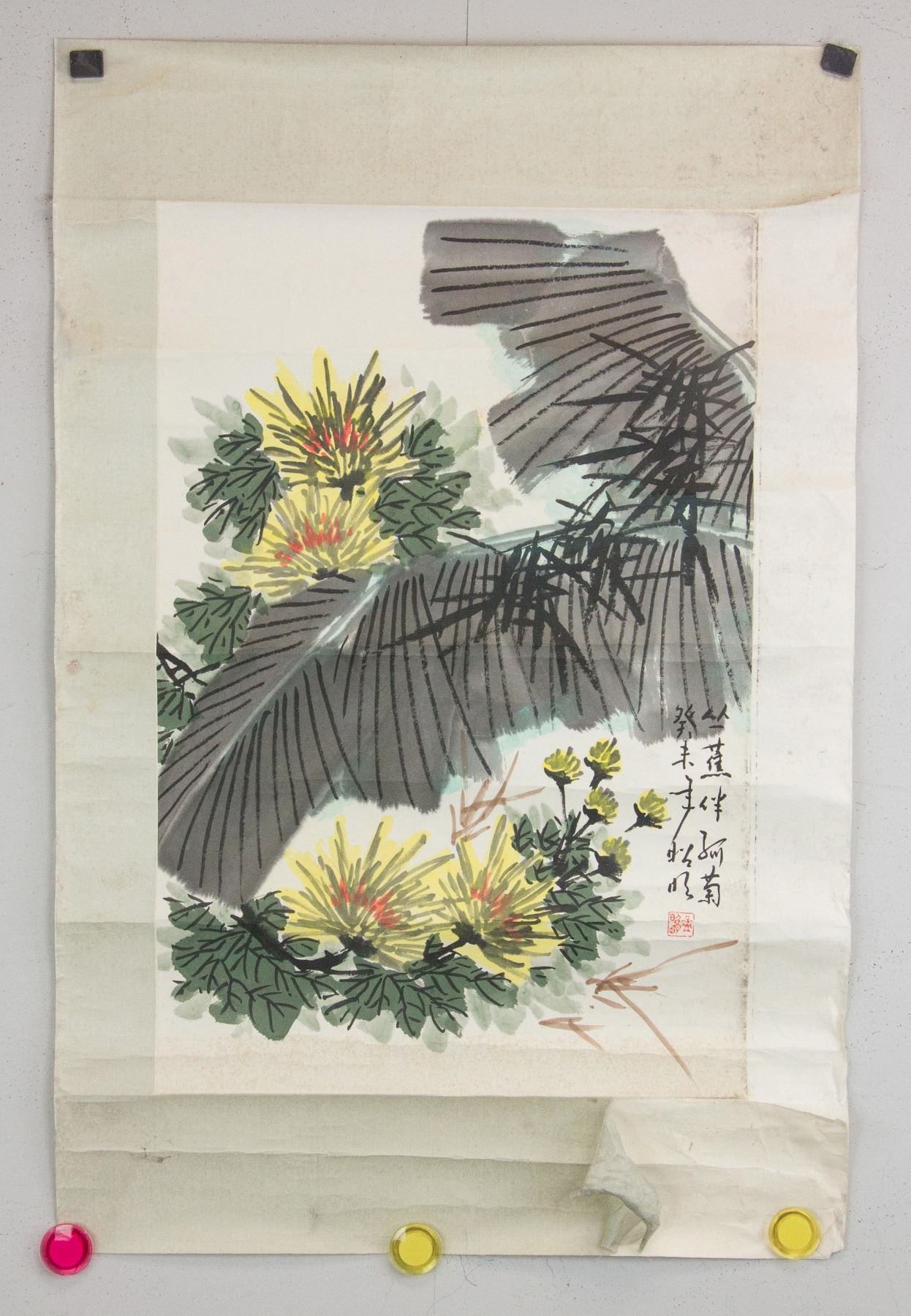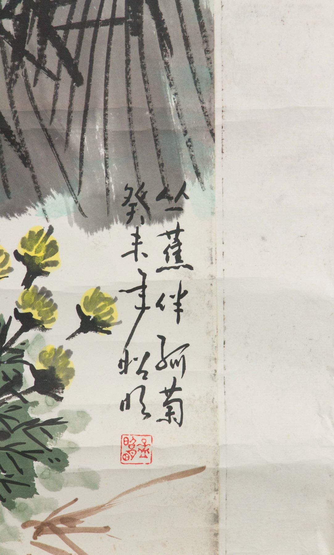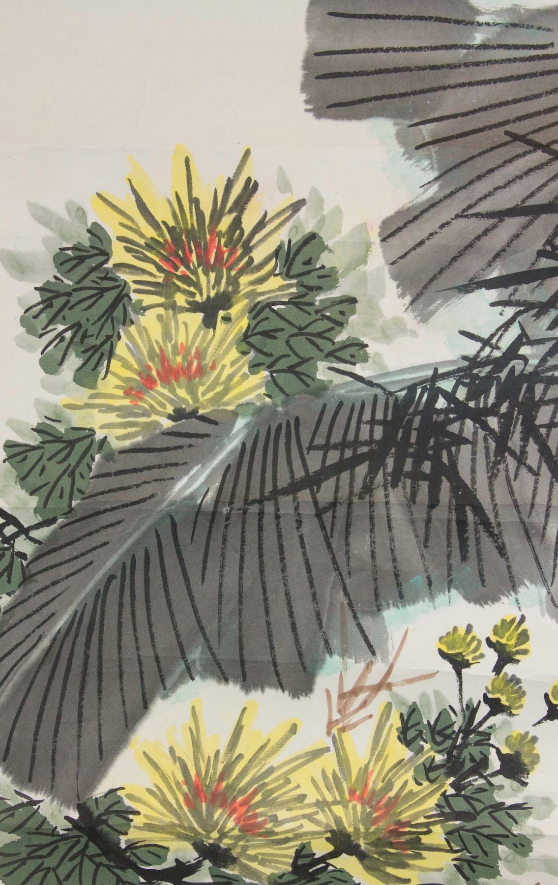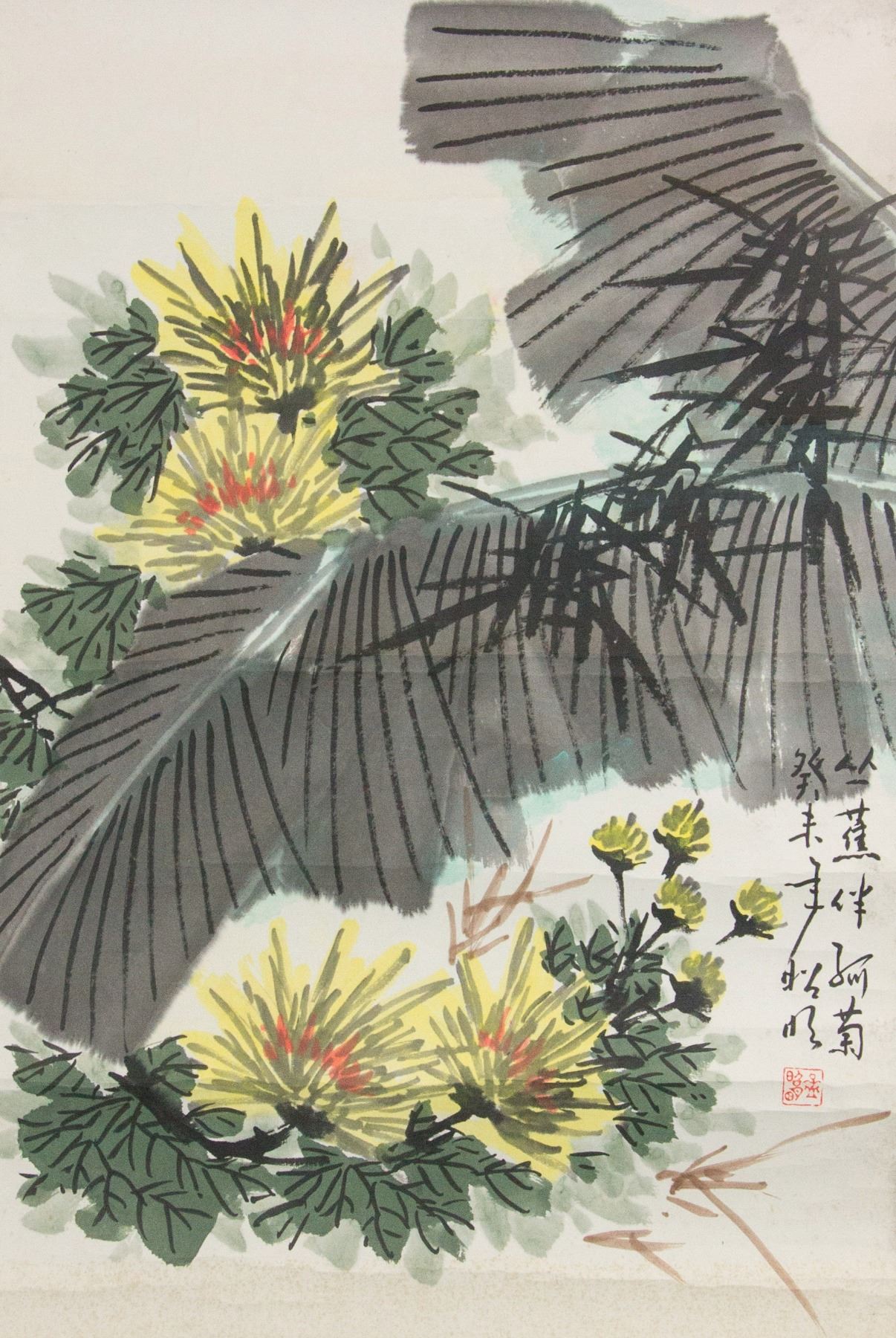 Painting of chrysanthemum and musa basjoo; Chinese ink and watercolour on paper roll; signed Meng Zhaoming (b.1945); inscribed with 1 artist seal; 68 cm x 45 cm
