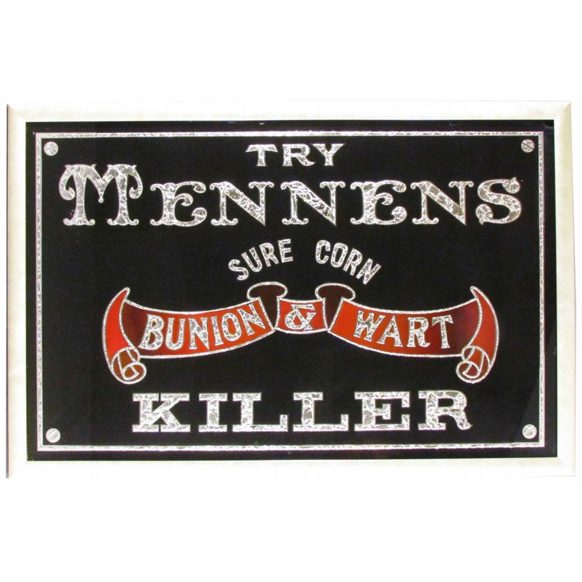 The Mennen's Sure Corn Bunion & Wart Killer Reverse Glass Sign with glue chip process. Attributed to Western Sandblasting Co. Chicago. Small chip in upper right corner otherwise near mint condition. 29 1/2 X 20 inches.