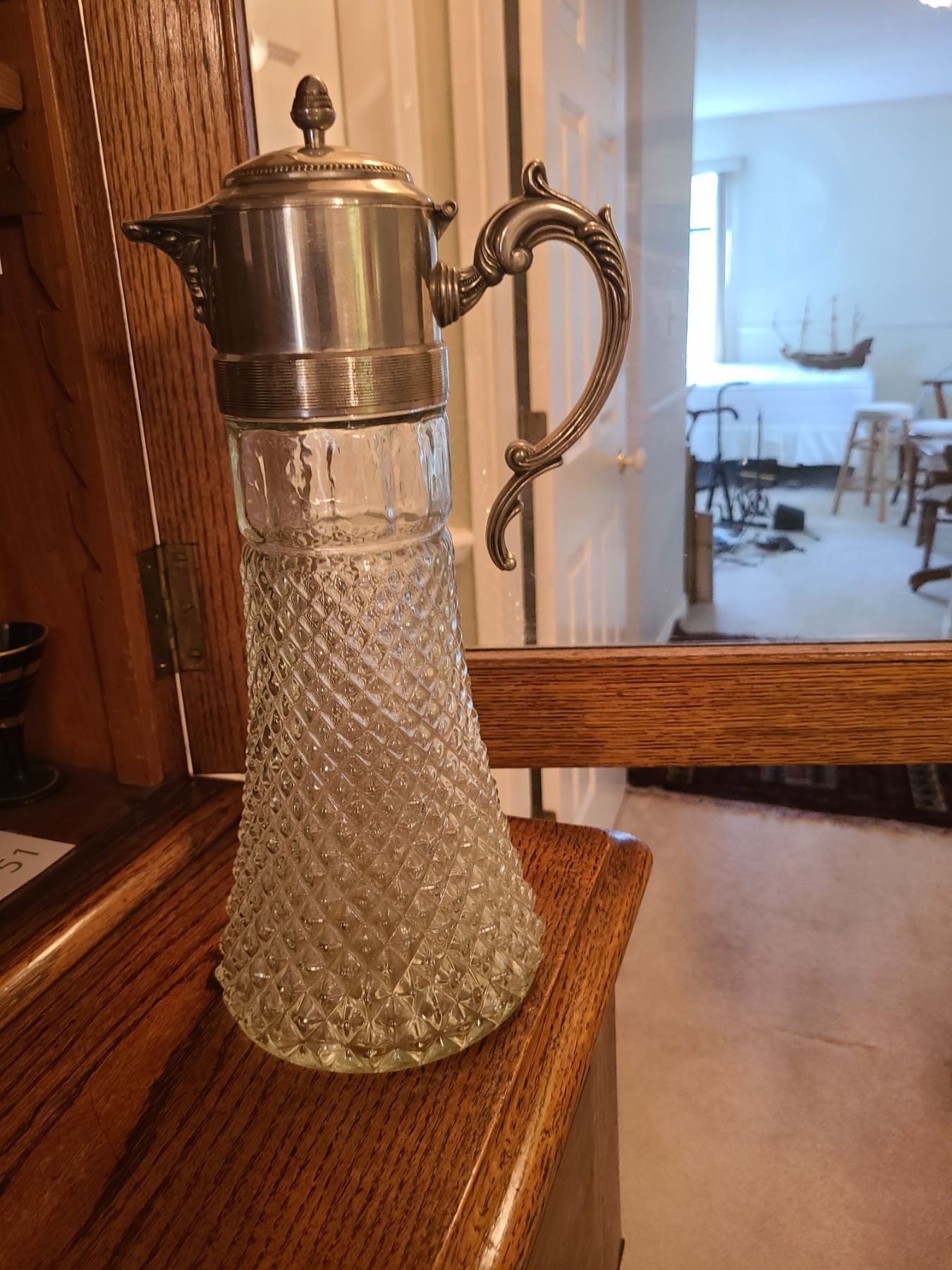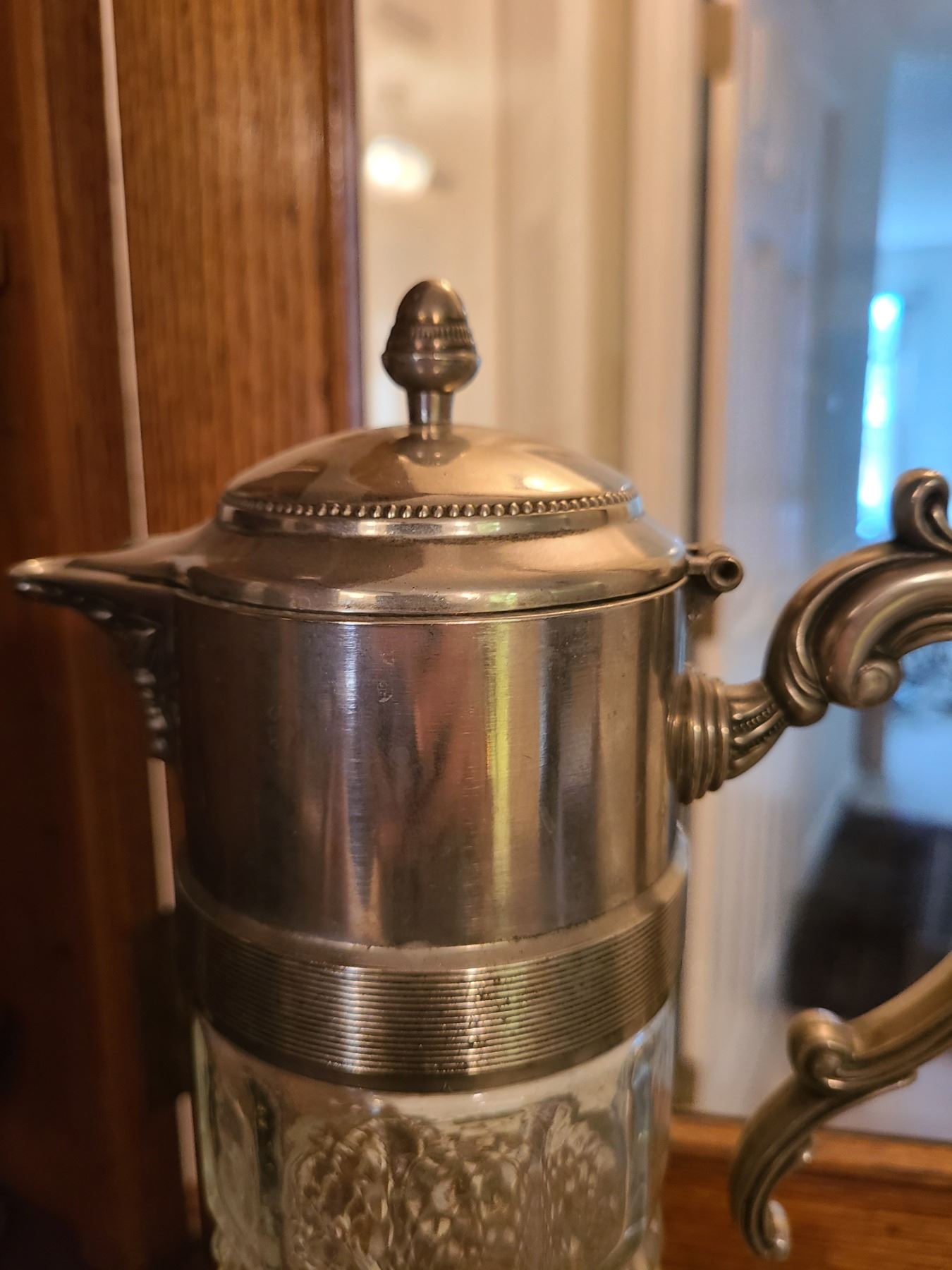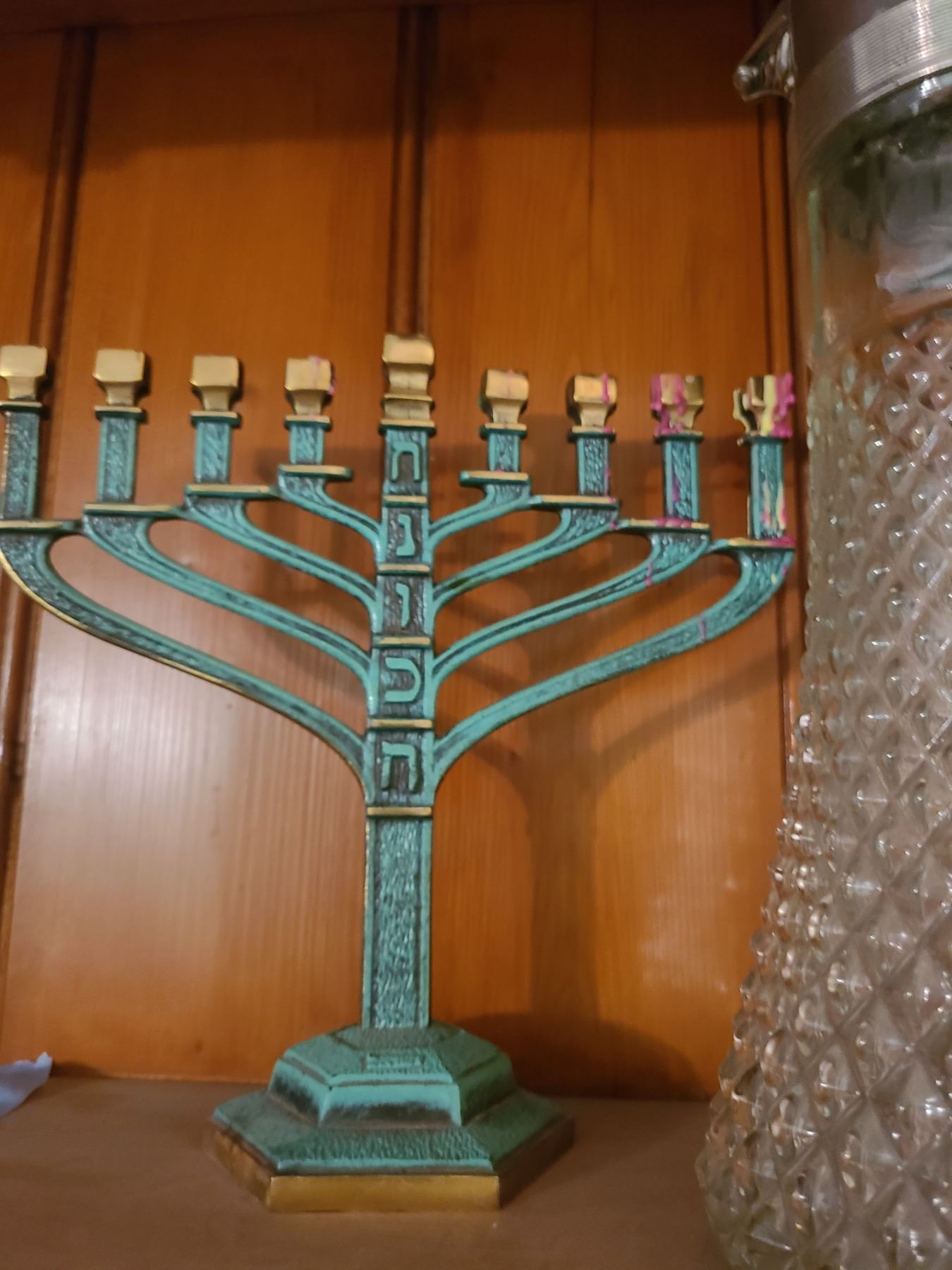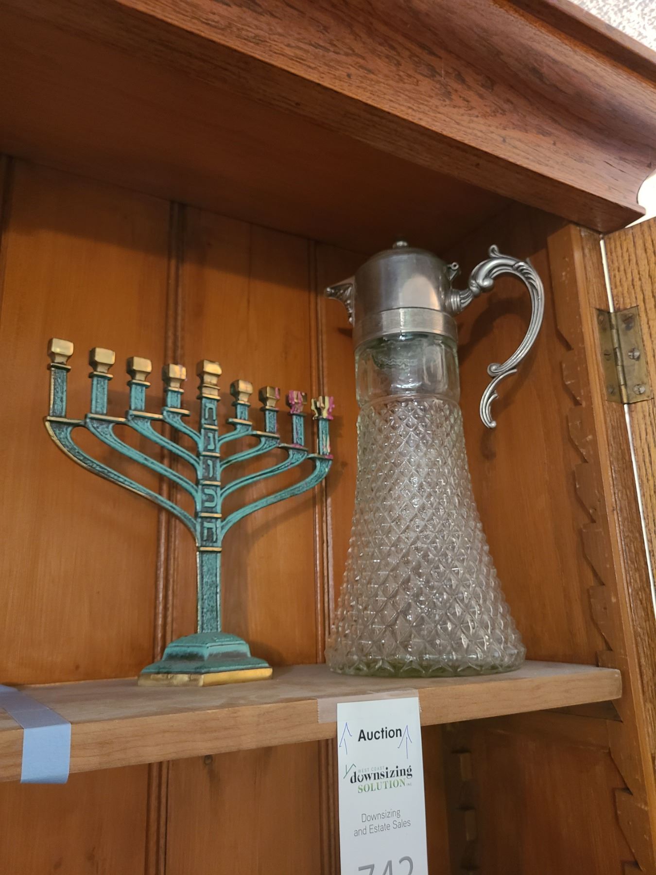 Brass Mennorah 9 inches. Cut glass decanter with silver plate handle and serving spout 14 inches tall. Puckupat 9 am