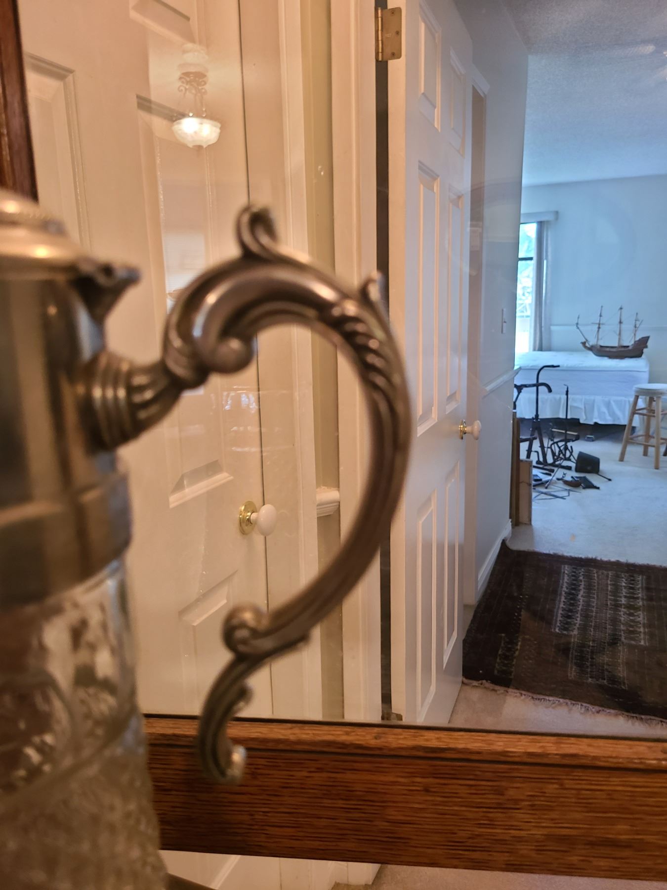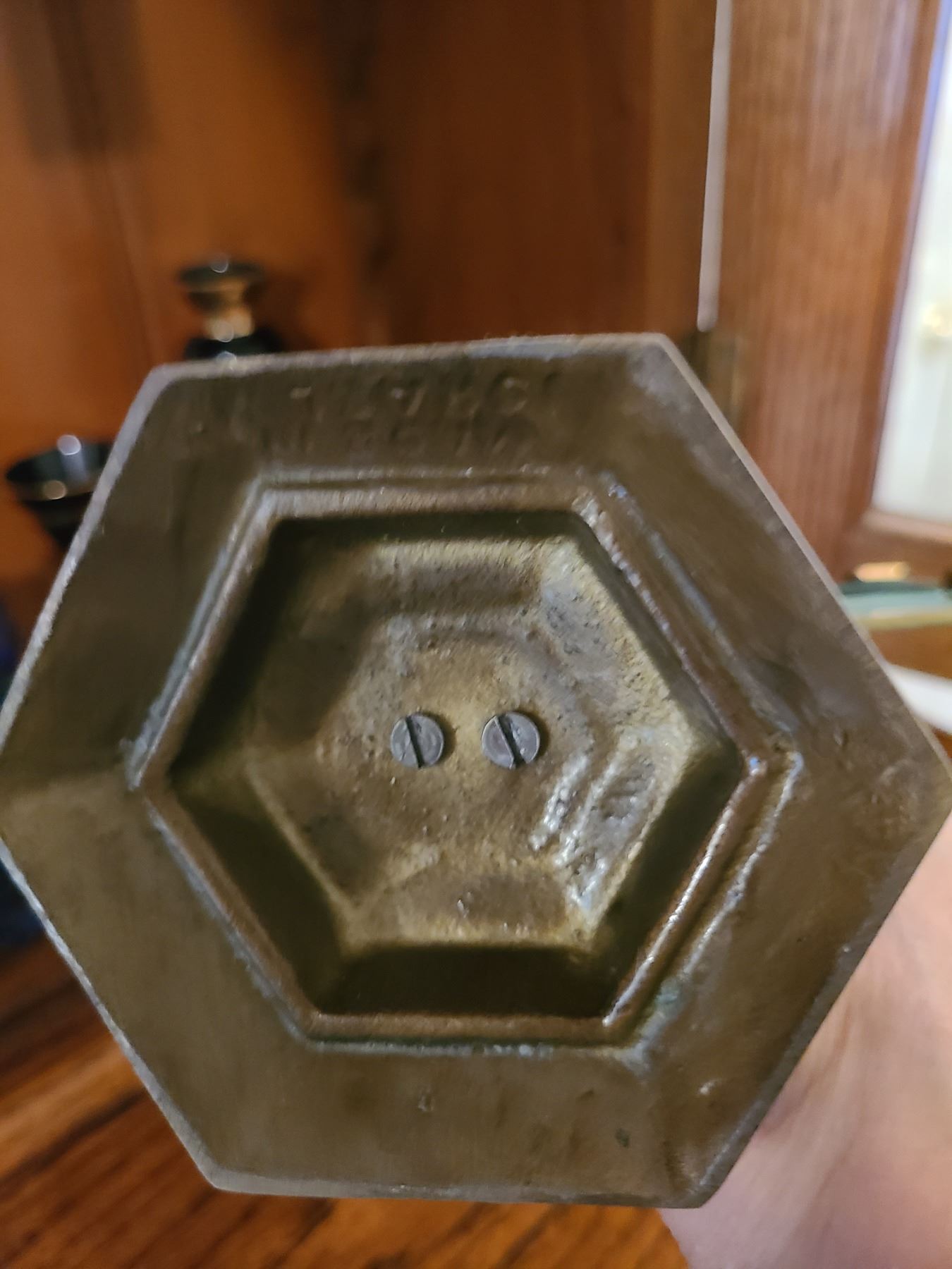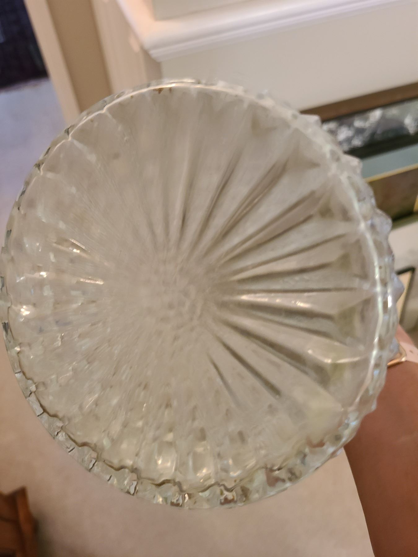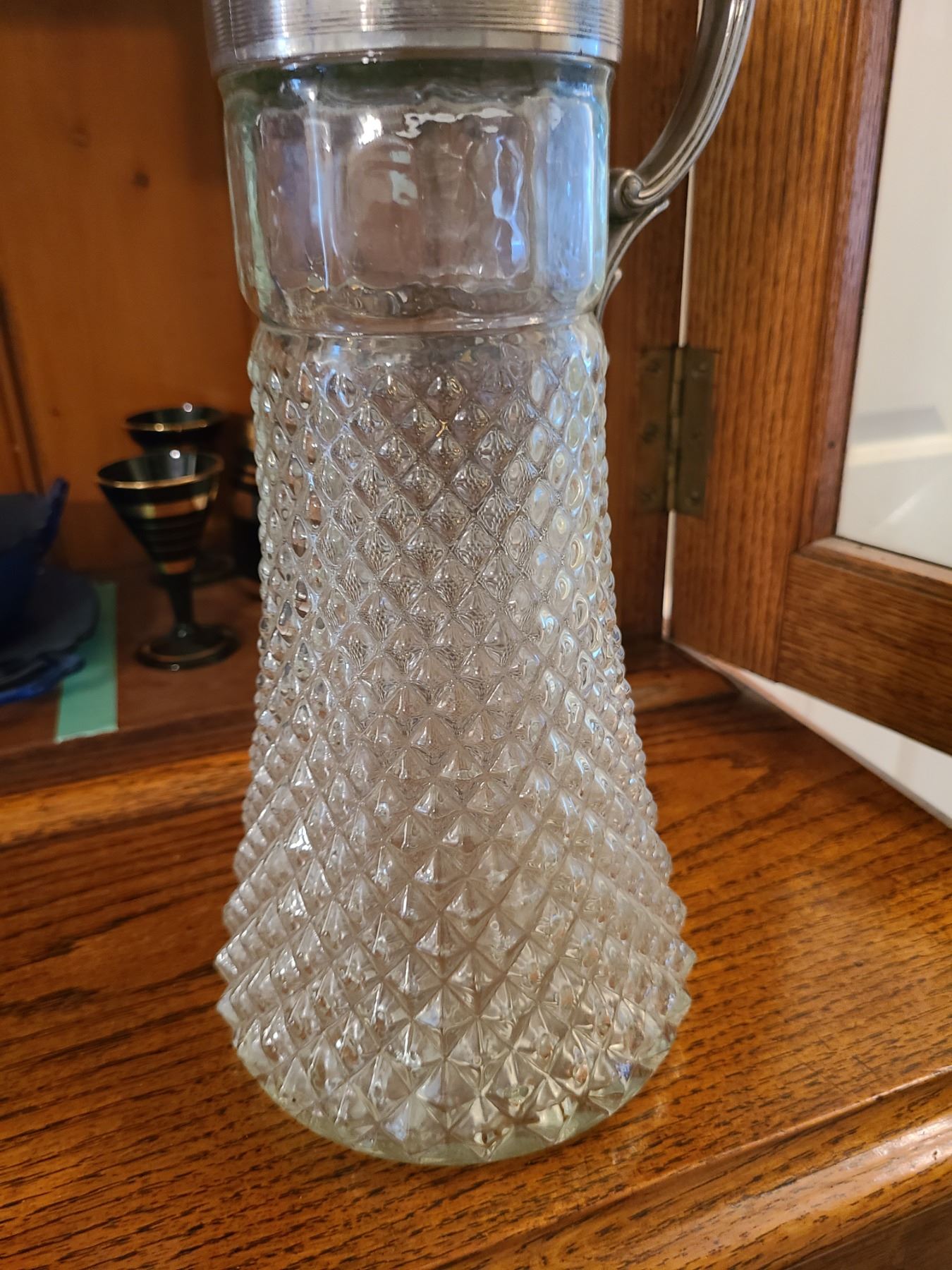 Brass Mennorah 9 inches. Cut glass decanter with silver plate handle and serving spout 14 inches tall. Puckupat 9 am