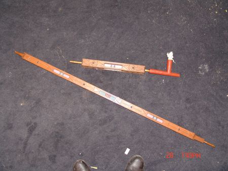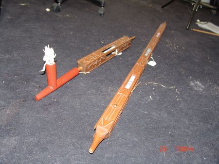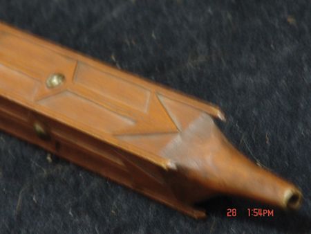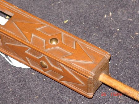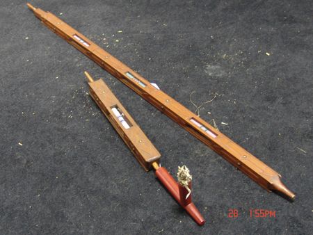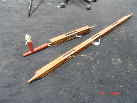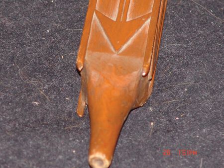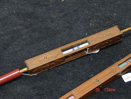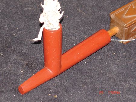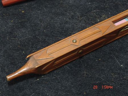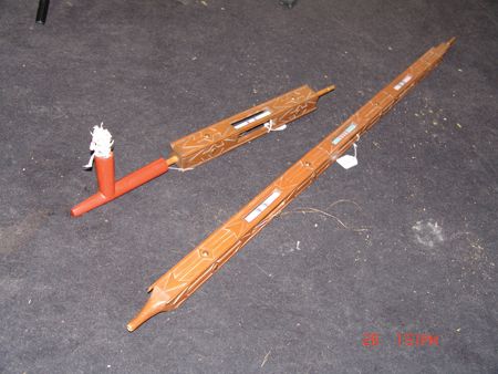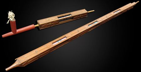 Late 1800s, Very rare three-piece set including a great catlinite T-bowl, plus two beautiful carved stems - a 16" version used for holding and a 56" version used for standing in a circle and passing around with the head resting on the ground. All in very good condition, some small tips missing on the stems. From the Herb and Peggy Puffer collection, Folsom, California. Head piece 8" x 4"