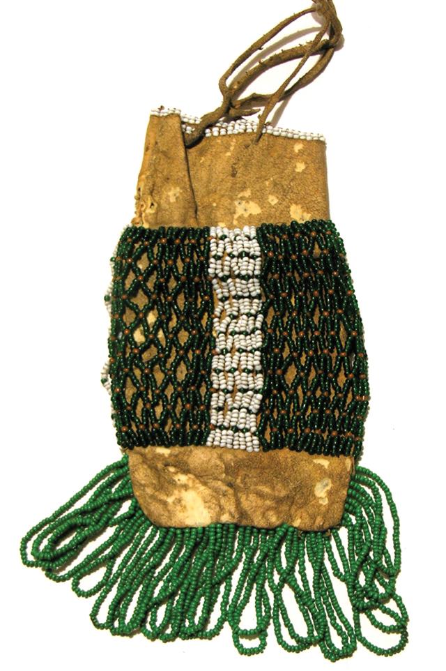 Circa 1940, Exquisite bead fringed pouch with small, dark green beads and white and green striped stripe down the middle. 7" x 3-1/4"