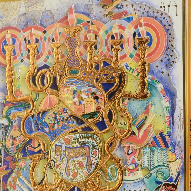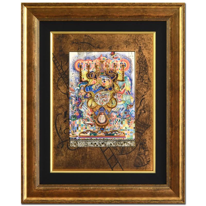 "Menorah" is a limited edition 3-layer decoupage by Raphael Abecassis, numbered 183 out of 295 and hand signed by the artist. This piece comes custom framed. Includes Certificate of Authenticity! Measures approx. 23" x 28" (with frame), 14.5" x 19" (image).