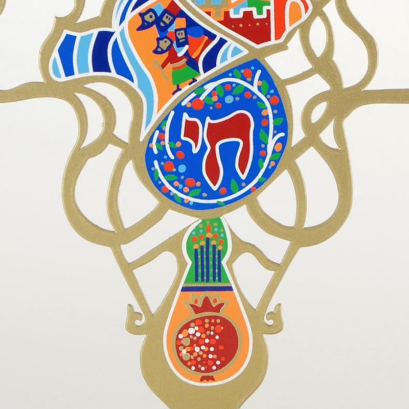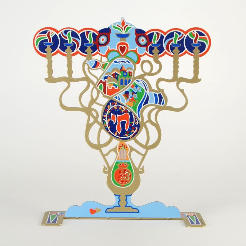 "Menorah" is a limited edition metal sculpture by Raphael Abecassis, numbered and hand signed by the artist. This piece features a different design on each side and is numbered in Hebrew on the sculpture's base. Includes Certificate of Authenticity. Measures approx. 12" (width) x 13.5" (height); 4" (depth of base).