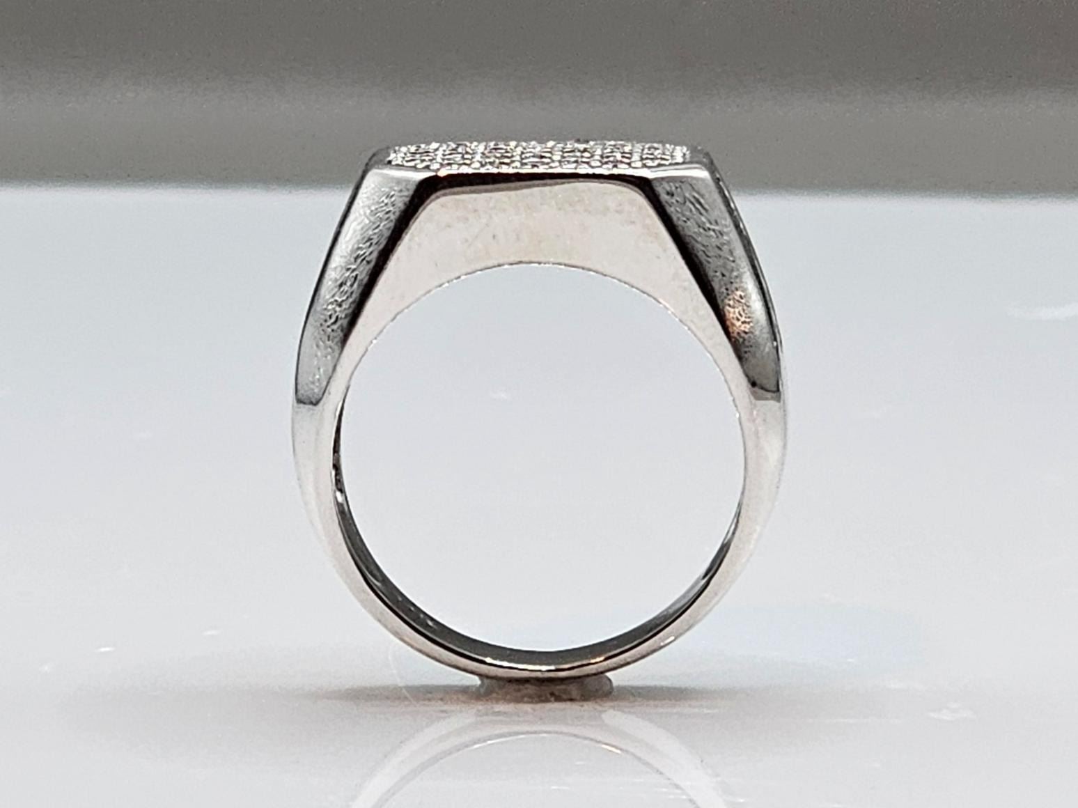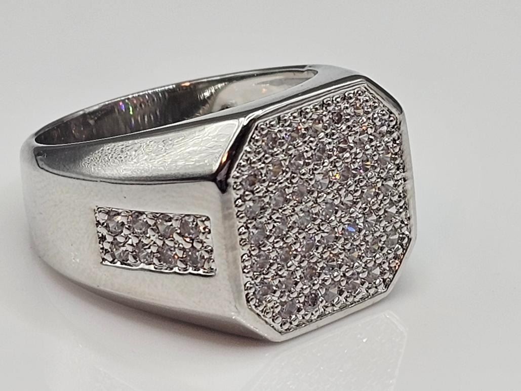One Men's Handsome 14 Kt White Gold 5.85 Cttw Lab Simulated Diamond Ring. These Sparkling Gemstones are all VVs1 Near Flawless and Mounted in 14 Kt. Tri-Layered White Gold, This ring is well-made with strong detail. A-1 Quality. Size 10.5. Total gram Wt is approx 9.9 total grams. This Ring Is Incredible. Don't Miss It!