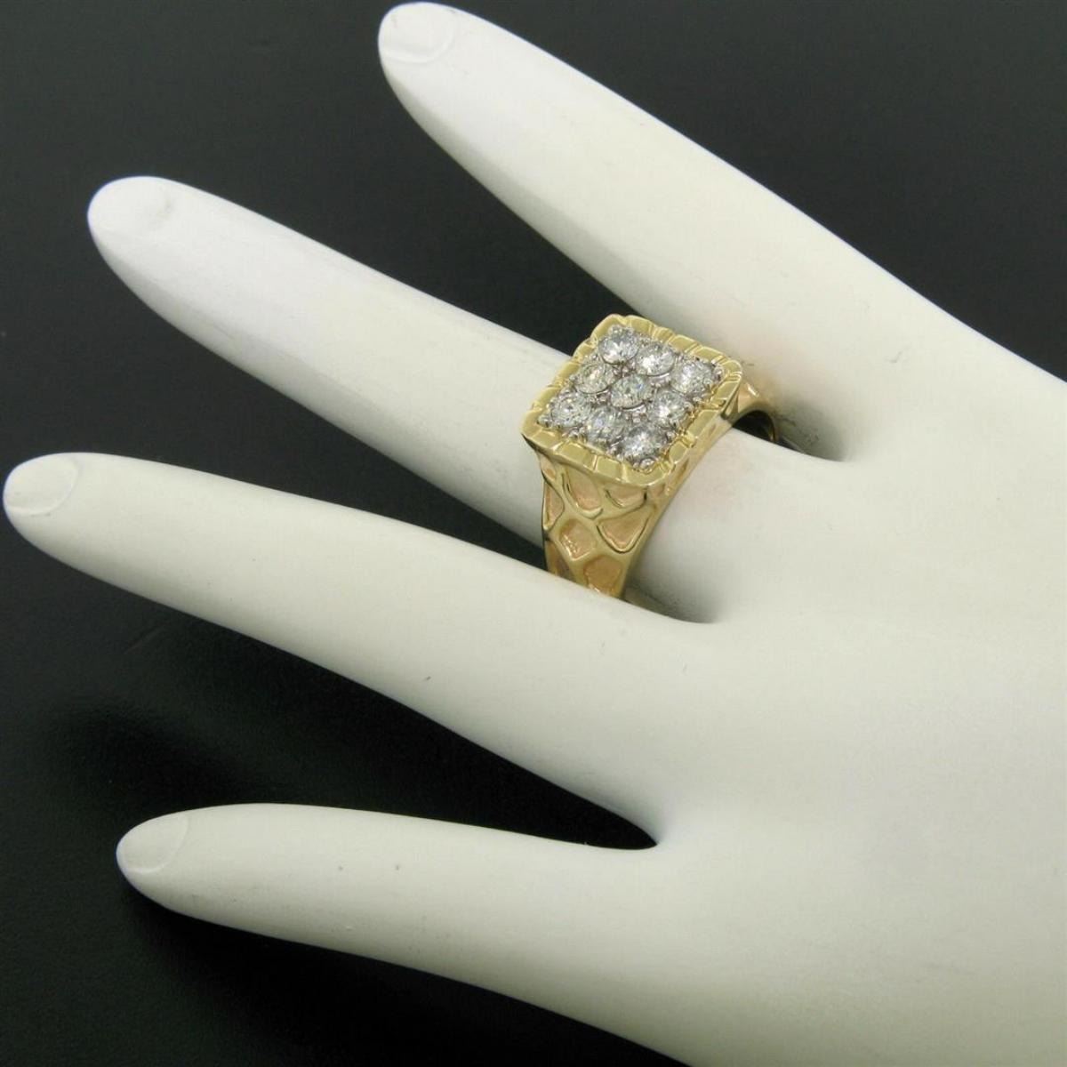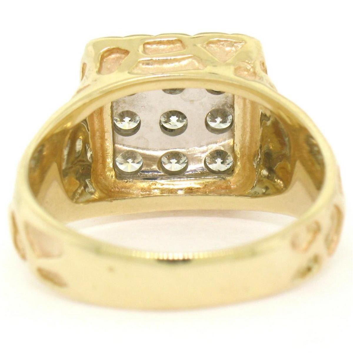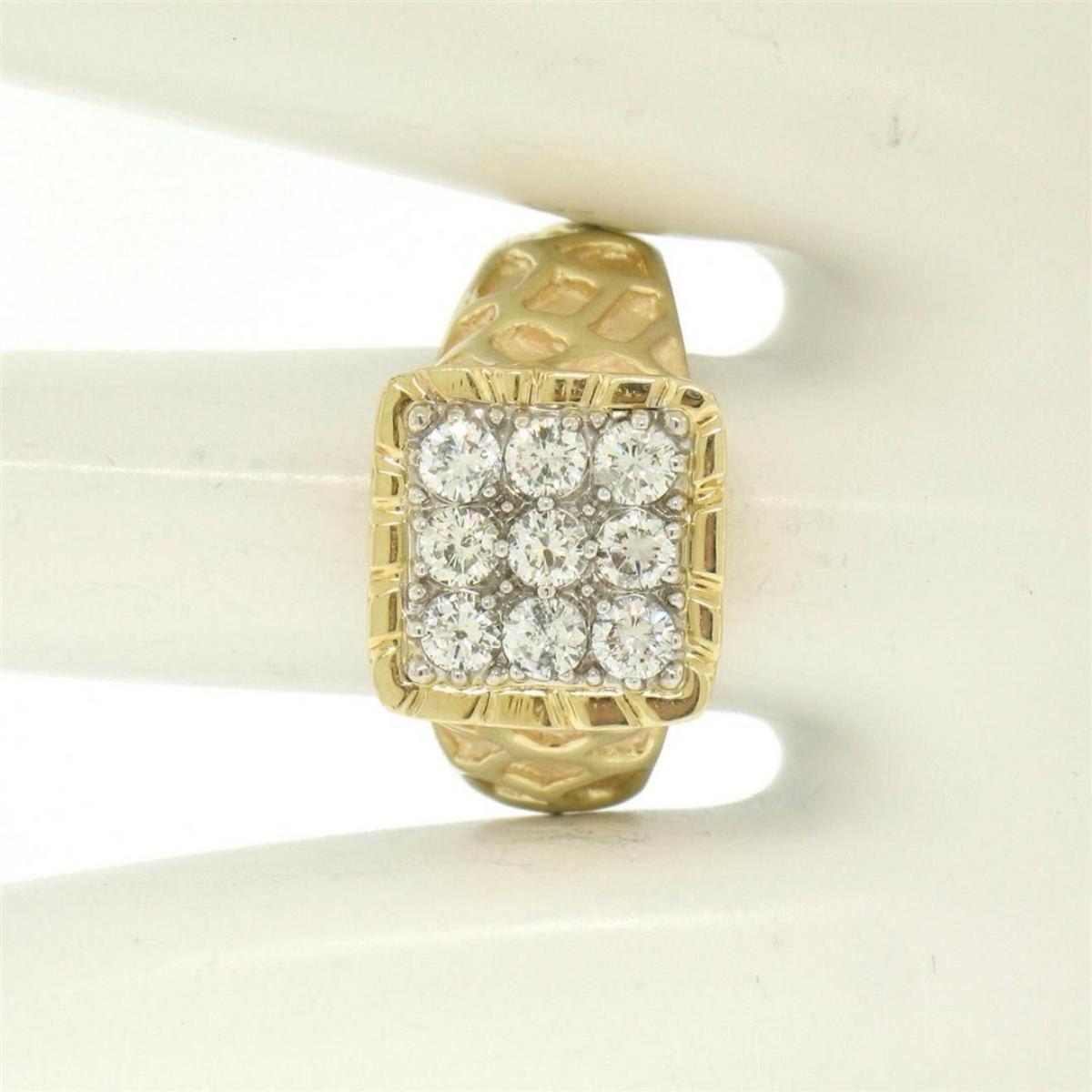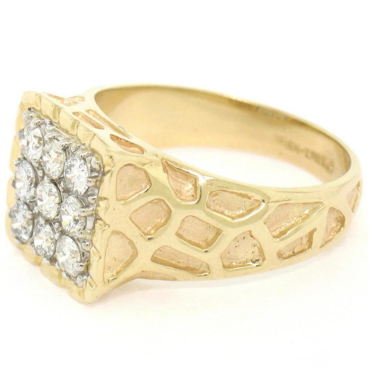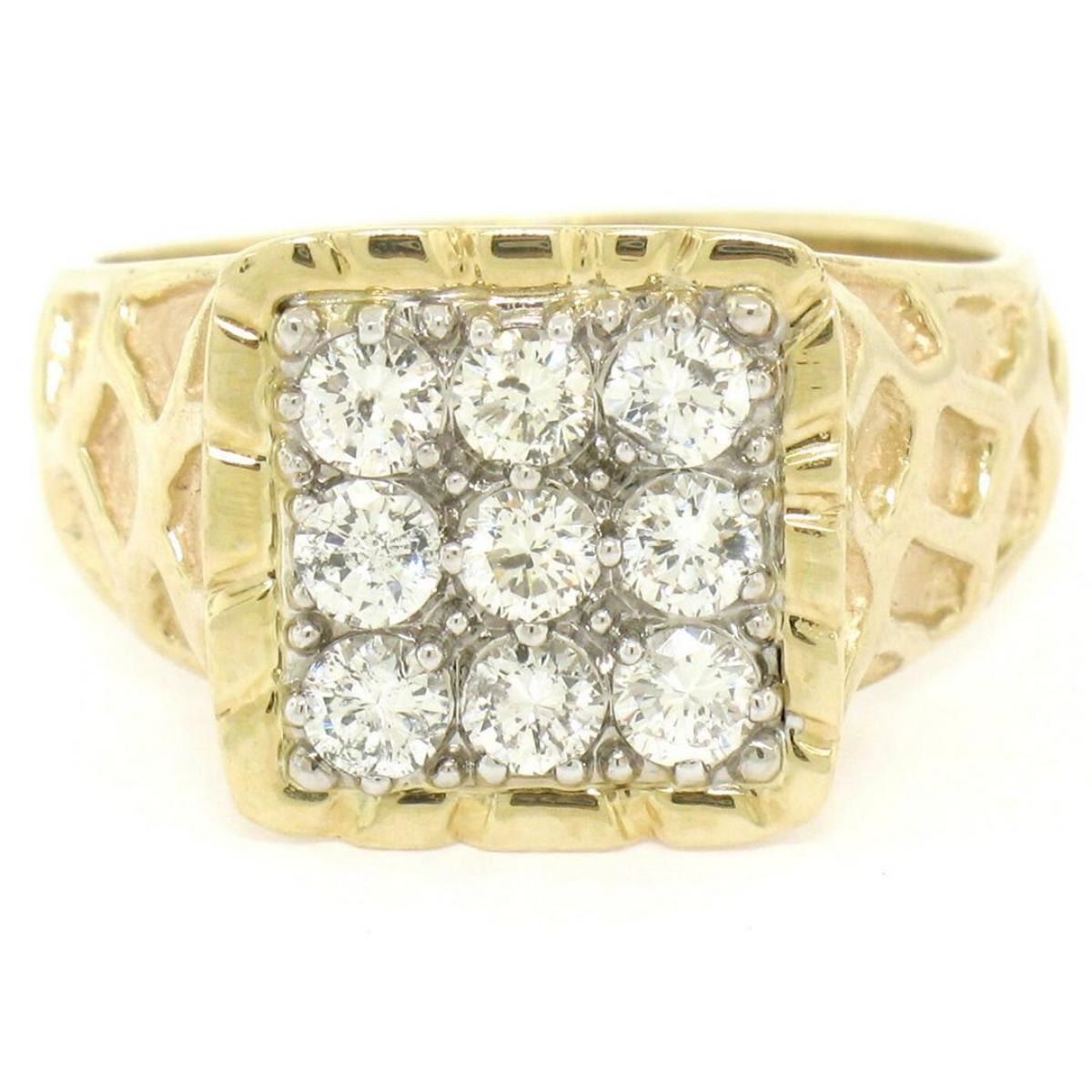 One Men's 14K Two Tone Gold Nugget Design .90ctw Round BRILLIANT Diamond Cluster Ring. Item Details: Material: 14K Solid Yellow Gold, Weight: 8.59 Grams, Stone(s): (9) Natural Genuine Diamonds - Round Brilliant Cut - Prong Set - F/G Color - VS2 Clarity, Total Carat Weight: 0.90 (approx.), Ring Size: 9.5 , Ring Width: 13.20mm, Ring Height: 5.9mm rise off the finger, Condition: Like New!