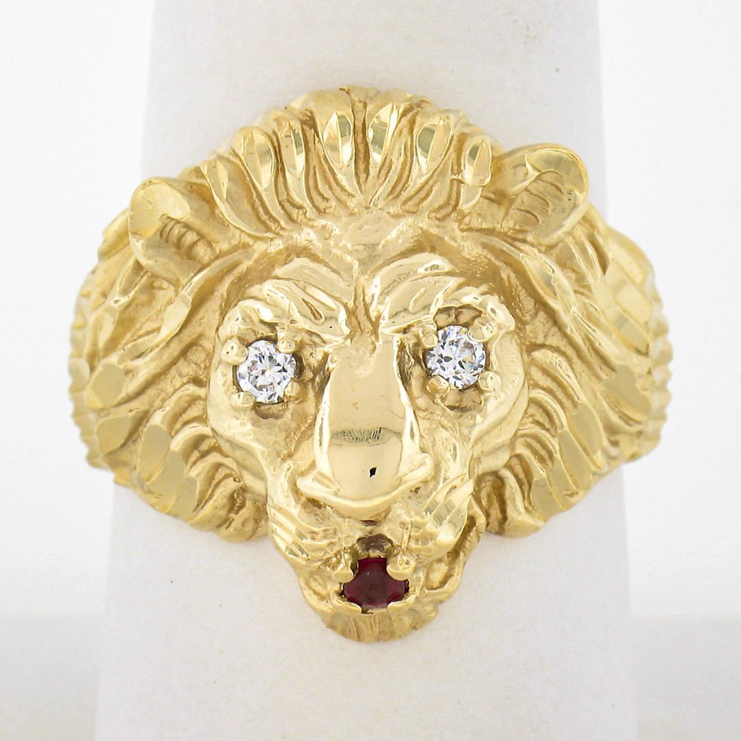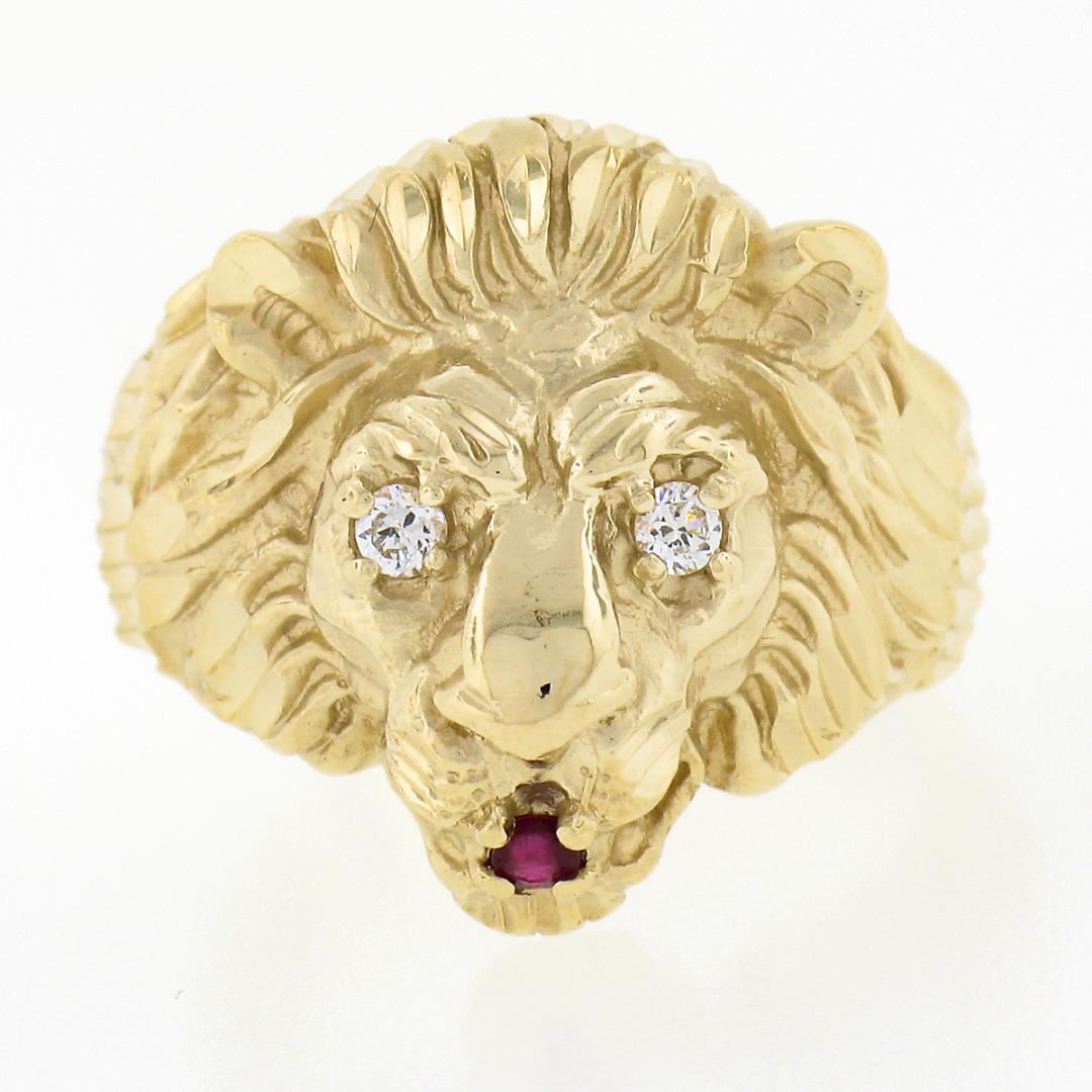 A solid 14k yellow gold lion ring, with 2 round brilliant cut natural diamonds (F/G - VS1/VS2 ; 0.08ctw), and 1 round brilliant cut natural ruby (0.05ct). The ring is size 8.5, weighs a total of 12.22 grams, and measures 20mm wide.
