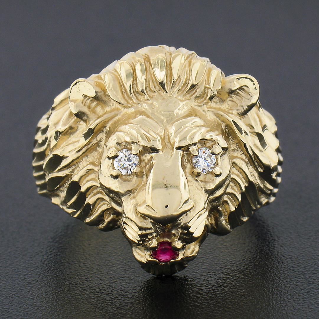 A solid 14k yellow gold lion ring, with 2 round brilliant cut natural diamonds (F/G - VS1/VS2 ; 0.08ctw), and 1 round brilliant cut natural ruby (0.05ct). The ring is size 8.5, weighs a total of 12.22 grams, and measures 20mm wide.