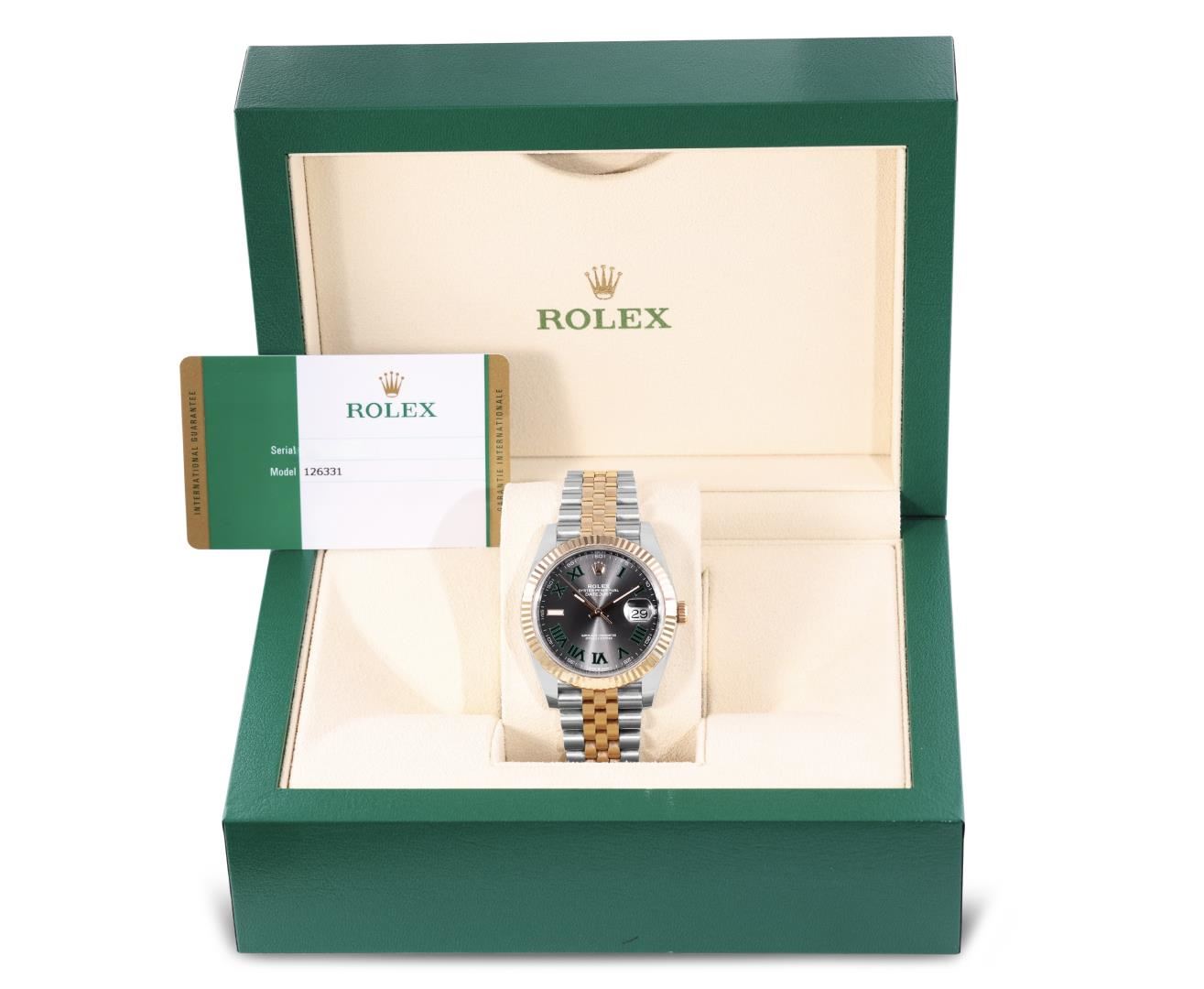 One Mens Pre Owned 18K Rose Gold And Stainless Steel Rolex Datejust 41MM Polished, Serviced and Electronically Tested, Rolex Rose Gold and Stainless Steel Case: 41mm, Rolex Yellow Gold Crown, Rolex Bezel: 18K Rose Gold Fluted Bezel. Crystal: Sapphire With Magnified Date Window. Rolex Hands: Lumi Hands. Rolex Movement: Automatic Winding Movement 3235. Rolex Dial: Factory Wimbledon Dial with Roman Hour Markers. Date Window: 3 O'Clock Position Date Display, Quickset, Model: Datejust 41MM. Condition: G-6 Extra Fine. Rolex Bracelet: Two Tone 18K Rose Gold And Stainless Steel Jubilee Band. Bright Polish. 7.0 Inch Length, Adjustable. Standard Clasp, With Rolex Logo. This Watch Has Been Serviced And Polished It Is Free Of All Scratches And Dents. This Watch Comes With A Rolex Box and Card.