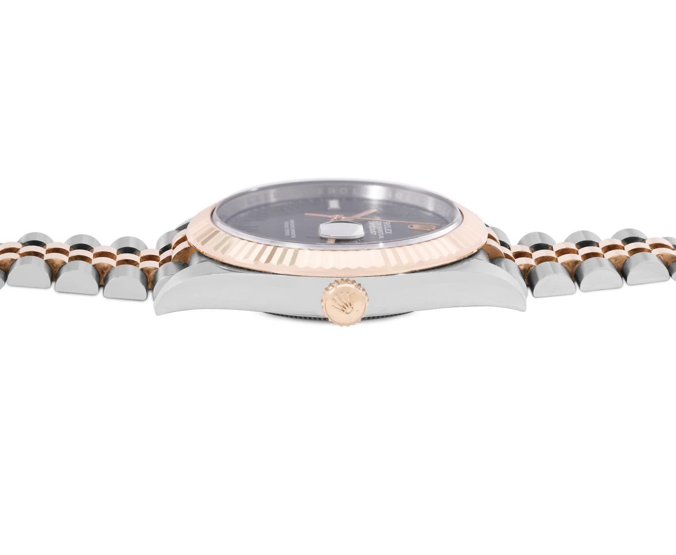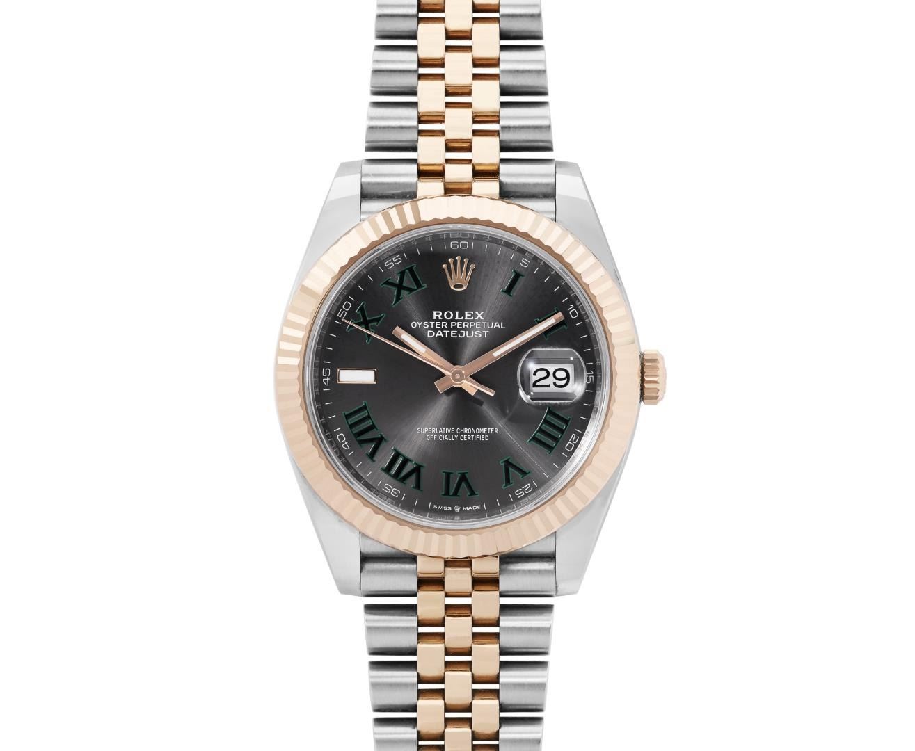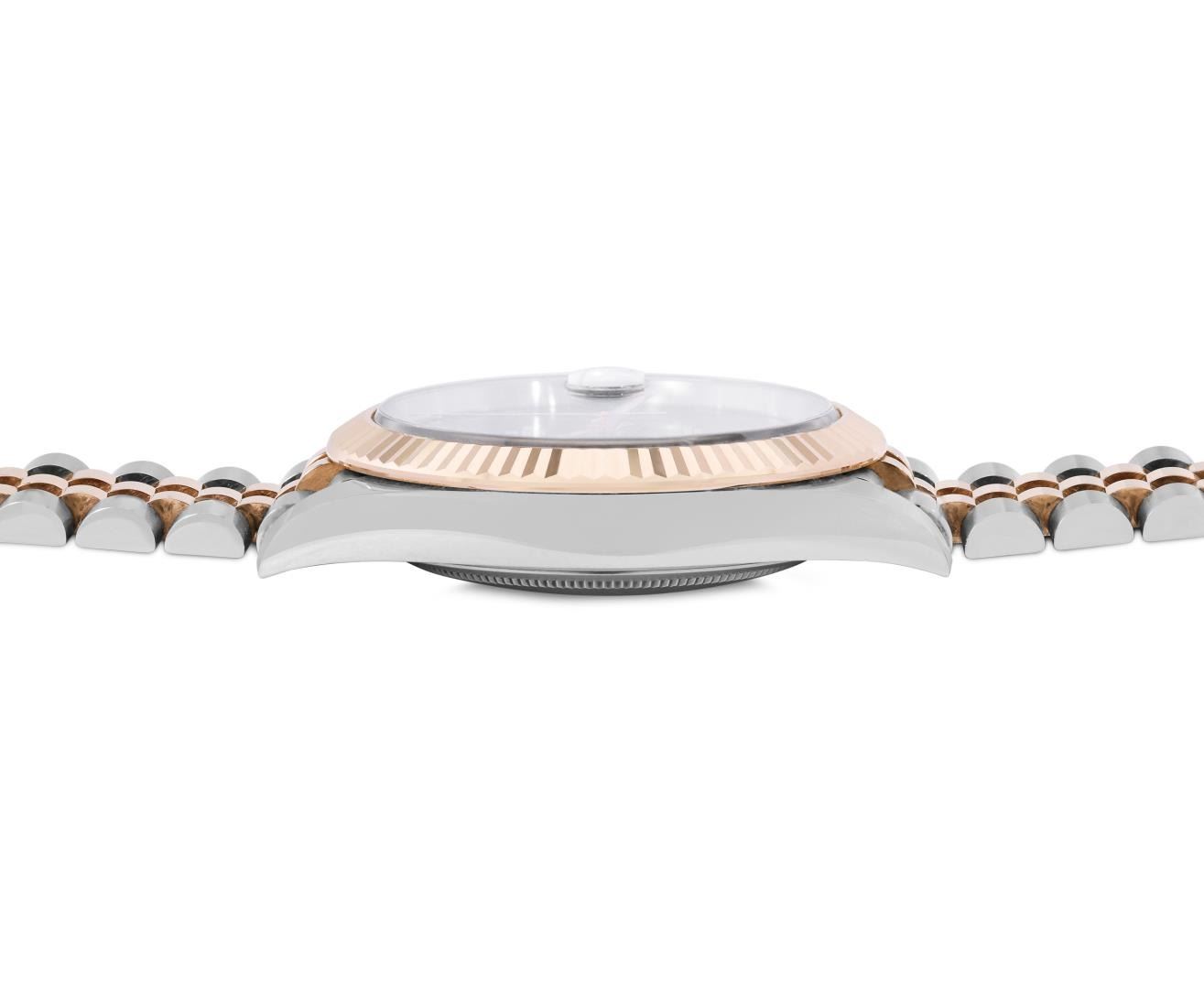 One Mens Pre Owned 18K Rose Gold And Stainless Steel Rolex Datejust 41MM Polished, Serviced and Electronically Tested, Rolex Rose Gold and Stainless Steel Case: 41mm, Rolex Yellow Gold Crown, Rolex Bezel: 18K Rose Gold Fluted Bezel. Crystal: Sapphire With Magnified Date Window. Rolex Hands: Lumi Hands. Rolex Movement: Automatic Winding Movement 3235. Rolex Dial: Factory Wimbledon Dial with Roman Hour Markers. Date Window: 3 O'Clock Position Date Display, Quickset, Model: Datejust 41MM. Condition: G-6 Extra Fine. Rolex Bracelet: Two Tone 18K Rose Gold And Stainless Steel Jubilee Band. Bright Polish. 7.0 Inch Length, Adjustable. Standard Clasp, With Rolex Logo. This Watch Has Been Serviced And Polished It Is Free Of All Scratches And Dents. This Watch Comes With A Rolex Box and Card.