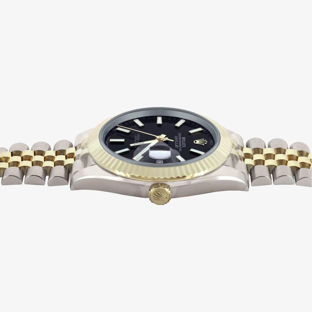 One Mens Pre Owned 18K Yellow Gold And Stainless Steel Rolex Datejust 41MM Polished, Serviced and Electronically Tested, Rolex Yellow Gold and Stainless Steel Case: 41mm, Rolex Yellow Gold Crown, Rolex Bezel: 18K Yellow Gold Fluted Bezel. Crystal: Sapphire With Magnified Date Window. Rolex Hands: Lumi Hands. Rolex Movement: Automatic Winding Movement 3235. Rolex Dial: Factory Black Dial with Luminous Index Hour Markers. Date Window: 3 O'Clock Position Date Display, Quickset, Model: Datejust 41MM. Condition: G-6 Extra Fine. Rolex Bracelet: Two Tone 18K Yellow Gold And Stainless Steel Jubilee Band. Bright Polish. 7.0 Inch Length, Adjustable. Standard Clasp, With Rolex Logo. This Watch Has Been Serviced And Polished It Is Free Of All Scratches And Dents. This Watch Comes With Rolex Box and Card.