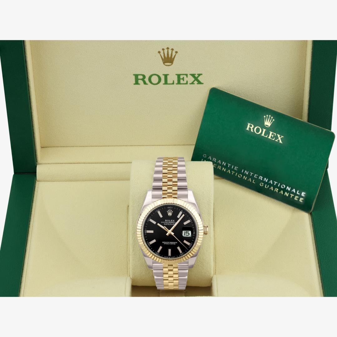 One Mens Pre Owned 18K Yellow Gold And Stainless Steel Rolex Datejust 41MM Polished, Serviced and Electronically Tested, Rolex Yellow Gold and Stainless Steel Case: 41mm, Rolex Yellow Gold Crown, Rolex Bezel: 18K Yellow Gold Fluted Bezel. Crystal: Sapphire With Magnified Date Window. Rolex Hands: Lumi Hands. Rolex Movement: Automatic Winding Movement 3235. Rolex Dial: Factory Black Dial with Luminous Index Hour Markers. Date Window: 3 O'Clock Position Date Display, Quickset, Model: Datejust 41MM. Condition: G-6 Extra Fine. Rolex Bracelet: Two Tone 18K Yellow Gold And Stainless Steel Jubilee Band. Bright Polish. 7.0 Inch Length, Adjustable. Standard Clasp, With Rolex Logo. This Watch Has Been Serviced And Polished It Is Free Of All Scratches And Dents. This Watch Comes With Rolex Box and Card.