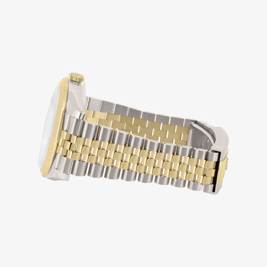 One Mens Pre Owned 18K Yellow Gold And Stainless Steel Rolex Datejust 41MM Polished, Serviced and Electronically Tested, Rolex Yellow Gold and Stainless Steel Case: 41mm, Rolex Yellow Gold Crown, Rolex Bezel: 18K Yellow Gold Fluted Bezel. Crystal: Sapphire With Magnified Date Window. Rolex Hands: Lumi Hands. Rolex Movement: Automatic Winding Movement 3235. Rolex Dial: Factory Black Dial with Luminous Index Hour Markers. Date Window: 3 O'Clock Position Date Display, Quickset, Model: Datejust 41MM. Condition: G-6 Extra Fine. Rolex Bracelet: Two Tone 18K Yellow Gold And Stainless Steel Jubilee Band. Bright Polish. 7.0 Inch Length, Adjustable. Standard Clasp, With Rolex Logo. This Watch Has Been Serviced And Polished It Is Free Of All Scratches And Dents. This Watch Comes With Rolex Box and Card.