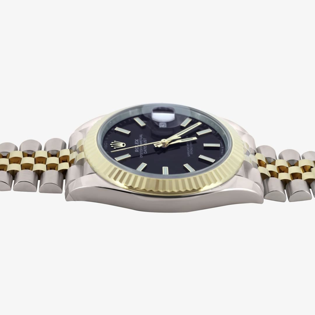One Mens Pre Owned 18K Yellow Gold And Stainless Steel Rolex Datejust 41MM Polished, Serviced and Electronically Tested, Rolex Yellow Gold and Stainless Steel Case: 41mm, Rolex Yellow Gold Crown, Rolex Bezel: 18K Yellow Gold Fluted Bezel. Crystal: Sapphire With Magnified Date Window. Rolex Hands: Lumi Hands. Rolex Movement: Automatic Winding Movement 3235. Rolex Dial: Factory Black Dial with Luminous Index Hour Markers. Date Window: 3 O'Clock Position Date Display, Quickset, Model: Datejust 41MM. Condition: G-6 Extra Fine. Rolex Bracelet: Two Tone 18K Yellow Gold And Stainless Steel Jubilee Band. Bright Polish. 7.0 Inch Length, Adjustable. Standard Clasp, With Rolex Logo. This Watch Has Been Serviced And Polished It Is Free Of All Scratches And Dents. This Watch Comes With Rolex Box and Card.