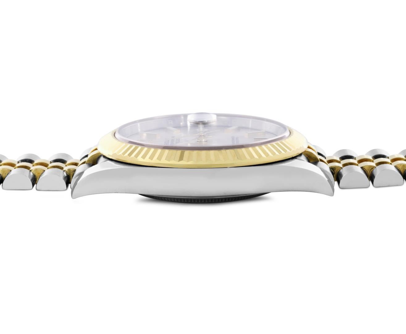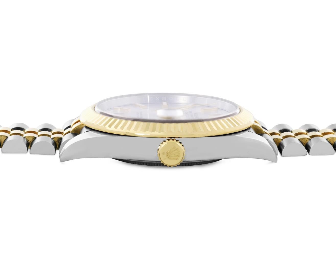 One Mens Pre Owned 18K Yellow Gold And Stainless Steel Rolex Datejust 41MM Polished, Serviced and Electronically Tested, Rolex Yellow Gold and Stainless Steel Case: 41mm, Rolex Yellow Gold Crown, Rolex Bezel: 18K Yellow Gold Fluted Bezel. Crystal: Sapphire With Magnified Date Window. Rolex Hands: Lumi Hands. Rolex Movement: Automatic Winding Movement 3235. Rolex Dial: Factory Silver Dial with Luminous Index Hour Markers. Date Window: 3 O'Clock Position Date Display, Quickset, Model: Datejust 41MM. Condition: G-6 Extra Fine. Rolex Bracelet: Two Tone 18K Yellow Gold And Stainless Steel Jubilee Band. Bright Polish. 7.0 Inch Length, Adjustable. Standard Clasp, With Rolex Logo. This Watch Has Been Serviced And Polished It Is Free Of All Scratches And Dents.