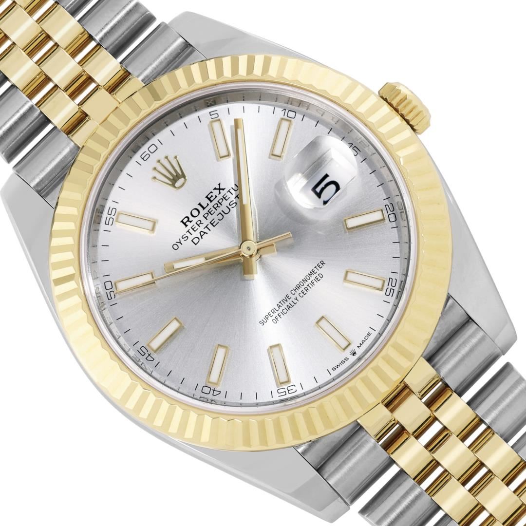 One Mens Pre Owned 18K Yellow Gold And Stainless Steel Rolex Datejust 41MM Polished, Serviced and Electronically Tested, Rolex Yellow Gold and Stainless Steel Case: 41mm, Rolex Yellow Gold Crown, Rolex Bezel: 18K Yellow Gold Fluted Bezel. Crystal: Sapphire With Magnified Date Window. Rolex Hands: Lumi Hands. Rolex Movement: Automatic Winding Movement 3235. Rolex Dial: Factory Silver Dial with Luminous Index Hour Markers. Date Window: 3 O'Clock Position Date Display, Quickset, Model: Datejust 41MM. Condition: G-6 Extra Fine. Rolex Bracelet: Two Tone 18K Yellow Gold And Stainless Steel Jubilee Band. Bright Polish. 7.0 Inch Length, Adjustable. Standard Clasp, With Rolex Logo. This Watch Has Been Serviced And Polished It Is Free Of All Scratches And Dents.