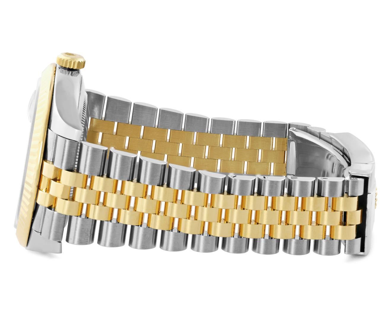 One Mens Pre Owned 18K Yellow Gold And Stainless Steel Rolex Datejust 41MM Polished, Serviced and Electronically Tested, Rolex Yellow Gold and Stainless Steel Case: 41mm, Rolex Yellow Gold Crown, Rolex Bezel: 18K Yellow Gold Fluted Bezel. Crystal: Sapphire With Magnified Date Window. Rolex Hands: Lumi Hands. Rolex Movement: Automatic Winding Movement 3235. Rolex Dial: Factory Silver Dial with Luminous Index Hour Markers. Date Window: 3 O'Clock Position Date Display, Quickset, Model: Datejust 41MM. Condition: G-6 Extra Fine. Rolex Bracelet: Two Tone 18K Yellow Gold And Stainless Steel Jubilee Band. Bright Polish. 7.0 Inch Length, Adjustable. Standard Clasp, With Rolex Logo. This Watch Has Been Serviced And Polished It Is Free Of All Scratches And Dents.