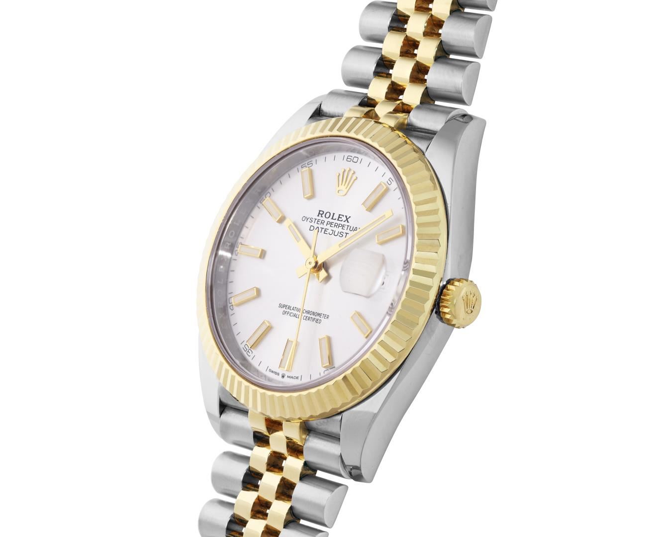 One Mens Pre Owned 18K Yellow Gold And Stainless Steel Rolex Datejust 41MM Polished, Serviced and Electronically Tested, Rolex Yellow Gold and Stainless Steel Case: 41mm, Rolex Yellow Gold Crown, Rolex Bezel: 18K Yellow Gold Fluted Bezel. Crystal: Sapphire With Magnified Date Window. Rolex Hands: Lumi Hands. Rolex Movement: Automatic Winding Movement 3235. Rolex Dial: Factory Silver Dial with Luminous Index Hour Markers. Date Window: 3 O'Clock Position Date Display, Quickset, Model: Datejust 41MM. Condition: G-6 Extra Fine. Rolex Bracelet: Two Tone 18K Yellow Gold And Stainless Steel Jubilee Band. Bright Polish. 7.0 Inch Length, Adjustable. Standard Clasp, With Rolex Logo. This Watch Has Been Serviced And Polished It Is Free Of All Scratches And Dents.