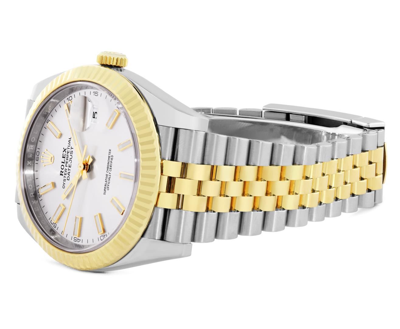 One Mens Pre Owned 18K Yellow Gold And Stainless Steel Rolex Datejust 41MM Polished, Serviced and Electronically Tested, Rolex Yellow Gold and Stainless Steel Case: 41mm, Rolex Yellow Gold Crown, Rolex Bezel: 18K Yellow Gold Fluted Bezel. Crystal: Sapphire With Magnified Date Window. Rolex Hands: Lumi Hands. Rolex Movement: Automatic Winding Movement 3235. Rolex Dial: Factory Silver Dial with Luminous Index Hour Markers. Date Window: 3 O'Clock Position Date Display, Quickset, Model: Datejust 41MM. Condition: G-6 Extra Fine. Rolex Bracelet: Two Tone 18K Yellow Gold And Stainless Steel Jubilee Band. Bright Polish. 7.0 Inch Length, Adjustable. Standard Clasp, With Rolex Logo. This Watch Has Been Serviced And Polished It Is Free Of All Scratches And Dents.