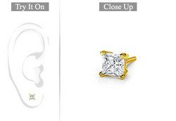 A princess-cut diamond is set in a rich 18K yellow gold 4-prong mounting. This diamond stud earring has a total weight (TDW) of 0.25 ct and is available in either screw-back or push-back.