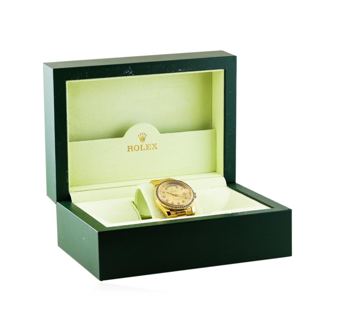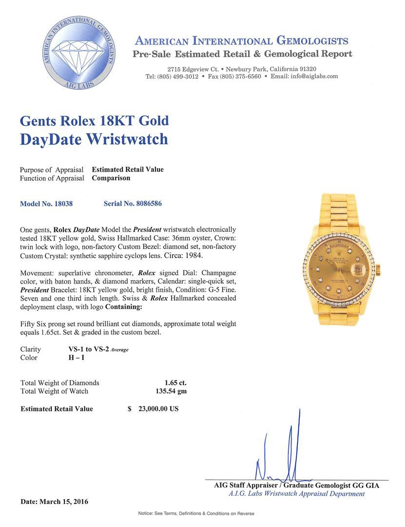 One gents, Rolex DayDate Model the President wristwatch electronically tested 18KT yellow gold, Swiss Hallmarked Case: 36mm oyster, Crown: twin lock with logo, non-factory Custom Bezel: diamond set, non-factory Custom Crystal: synthetic sapphire cyclops lens. Circa: 1984.Movement: superlative chronometer, Rolex signed Dial: Champagne color, with baton hands, & diamond markers, Calendar: single-quick set, President Bracelet: 18KT yellow gold, bright finish, Condition: G-5 Fine. Seven and one third inch length. Swiss & Rolex Hallmarked concealed deployment clasp, with logo Containing: Fifty Six prong set round brilliant cut diamonds, approximate total weight equals 1.65ct. Set & graded in the custom bezel. Clarity: VS-1 to VS-2 Average. Color: H - I. Total Weight of Diamonds 1.65ct. Total Weight of Watch 135.54gm. This watch comes with Rolex Box. AIG Appraised at $23,000.00.