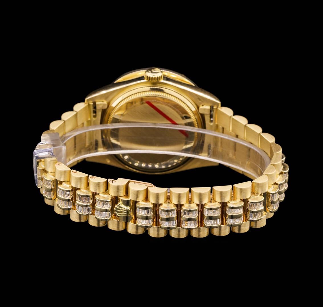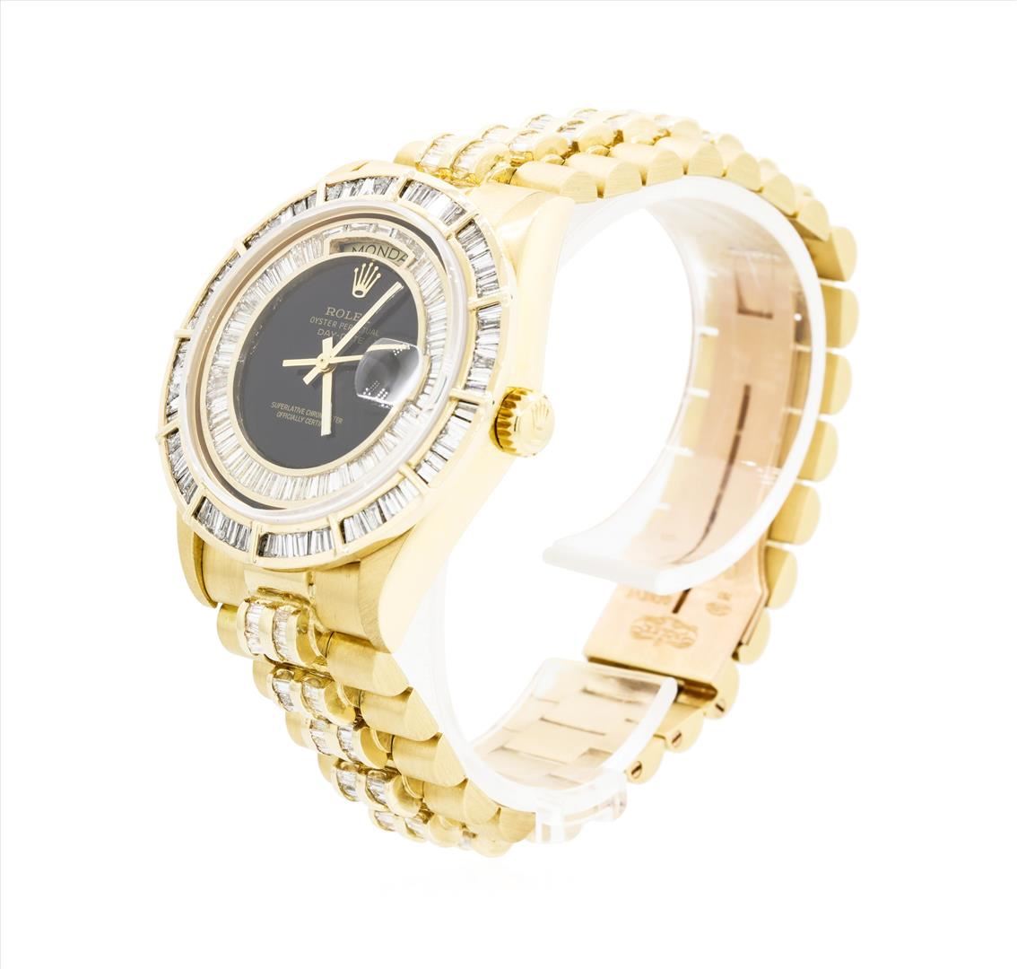 One gents, hand crafted & machine milled Rolex Crown Collection Style Super President DayDate Model wristwatch electro-chemically tested 18KT Yellow gold. Swiss Hallmarked Case: 36mm oyster, Rolex Signature Crown: twin lock with high relief logo, Custom non-factory Bezel: diamond set, Custom non-factory Crystal: synthetic sapphire cyclops lens. Circa: 1979.Movement: automatic, Custom non-factory Dial: luminous baton hands set above a Black color field, framed by a ribbon of diamonds, Calendar: single quickset, Customized Rolex Bracelet: 18KT Yellow gold, Super President style, diamonds set throughout, Condition: G-5 Fine. Seven and three quarter inch length. Five removable links. Rolex and Swiss Hallmarked concealed deployment clasp, with logo. Containing:Approximately Three Hundred Eighty channel and tension set baguette cut diamonds, approximate total weight of Stones = 10.00ct. Set & graded in the bracelet, bezel, and the dial. The color and clarity grade reflects the average range of color and clarity for the group. Clarity VVS-2 to VS-2. Color: E - GTotal Weight of Diamonds 10.00ct. Total Weight of Watch 159.21gm. AIG Appraised.