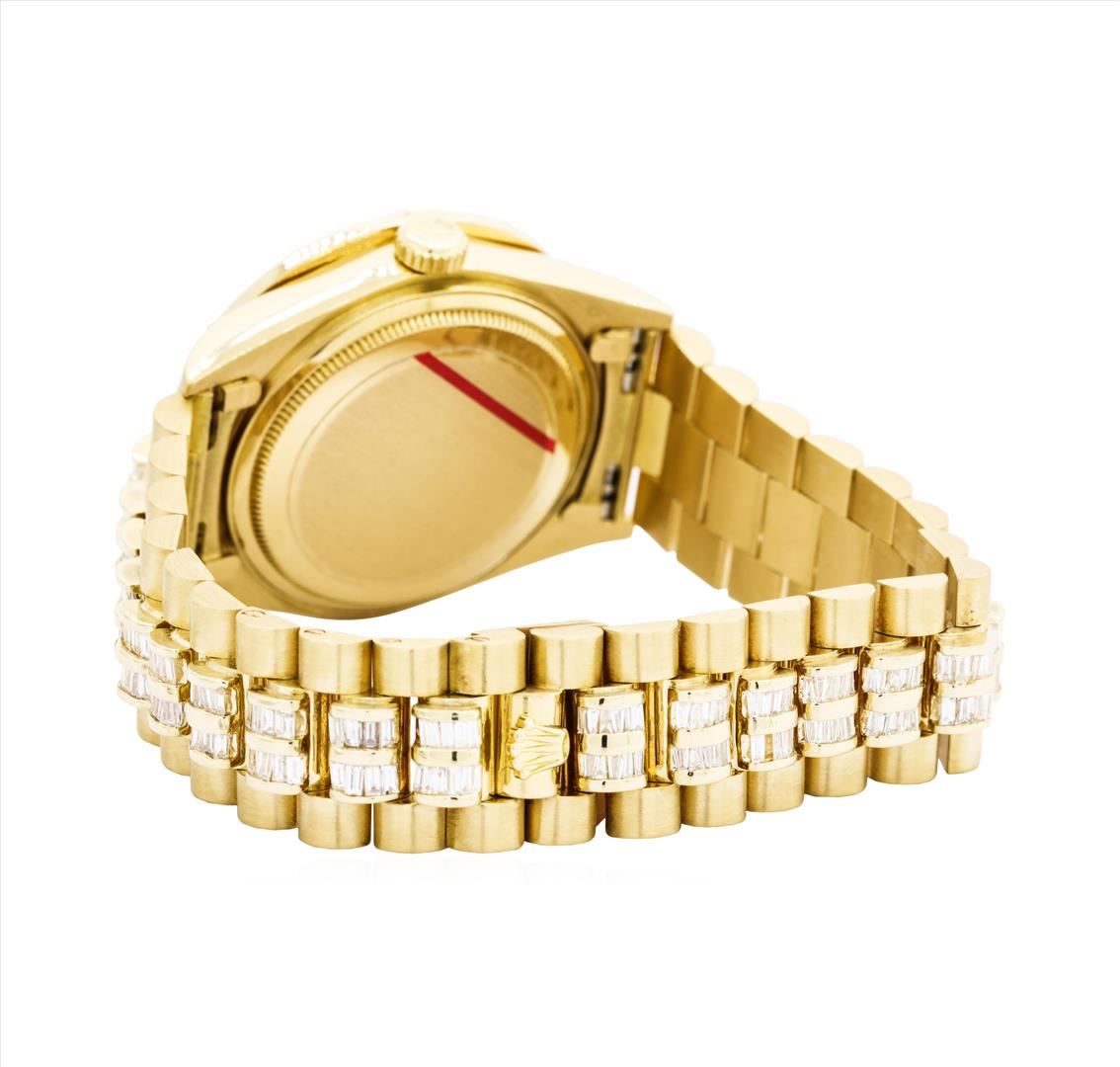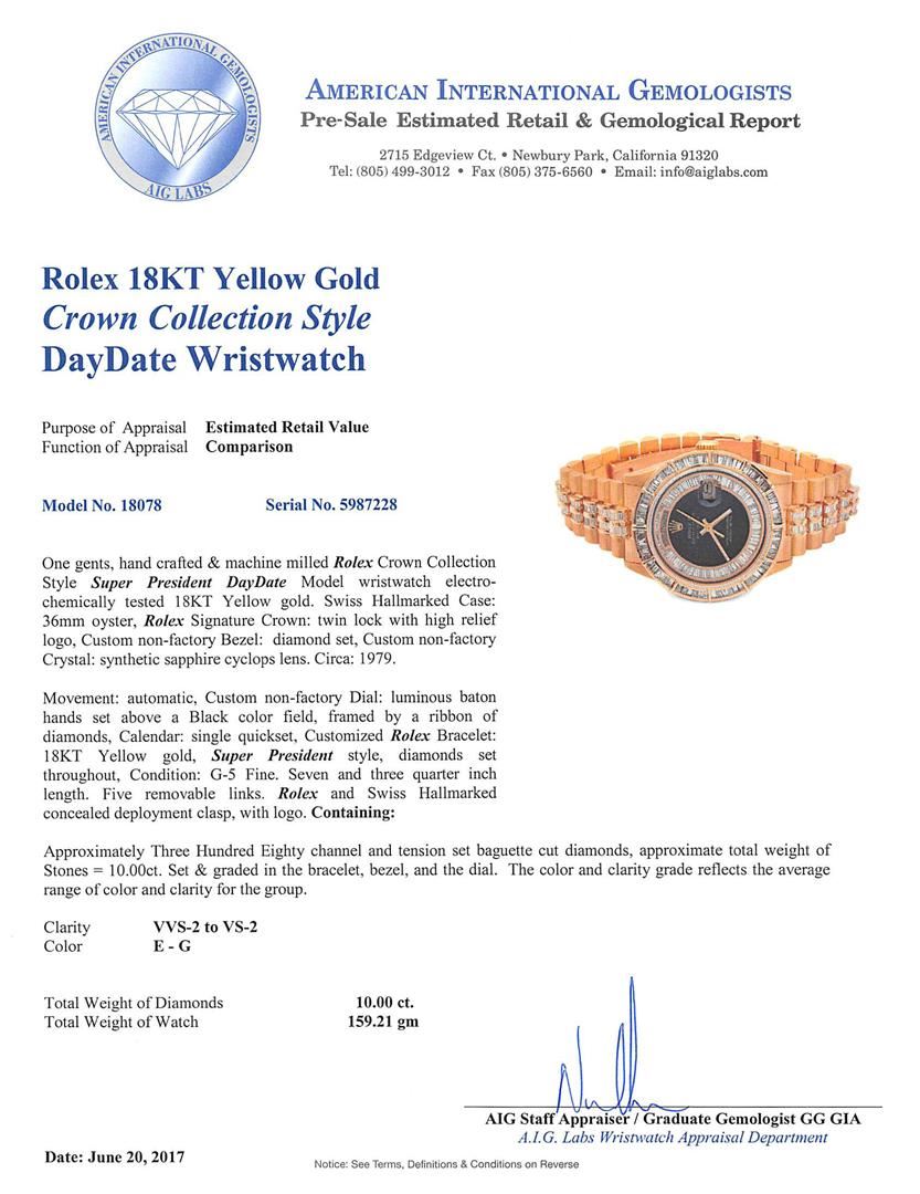 One gents, hand crafted & machine milled Rolex Crown Collection Style Super President DayDate Model wristwatch electro-chemically tested 18KT Yellow gold. Swiss Hallmarked Case: 36mm oyster, Rolex Signature Crown: twin lock with high relief logo, Custom non-factory Bezel: diamond set, Custom non-factory Crystal: synthetic sapphire cyclops lens. Circa: 1979.Movement: automatic, Custom non-factory Dial: luminous baton hands set above a Black color field, framed by a ribbon of diamonds, Calendar: single quickset, Customized Rolex Bracelet: 18KT Yellow gold, Super President style, diamonds set throughout, Condition: G-5 Fine. Seven and three quarter inch length. Five removable links. Rolex and Swiss Hallmarked concealed deployment clasp, with logo. Containing:Approximately Three Hundred Eighty channel and tension set baguette cut diamonds, approximate total weight of Stones = 10.00ct. Set & graded in the bracelet, bezel, and the dial. The color and clarity grade reflects the average range of color and clarity for the group. Clarity VVS-2 to VS-2. Color: E - GTotal Weight of Diamonds 10.00ct. Total Weight of Watch 159.21gm. AIG Appraised.