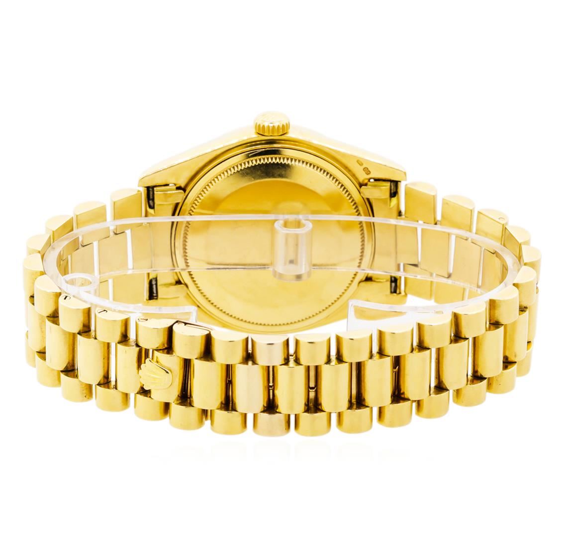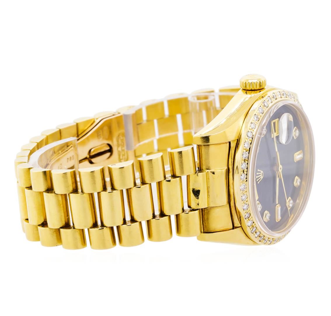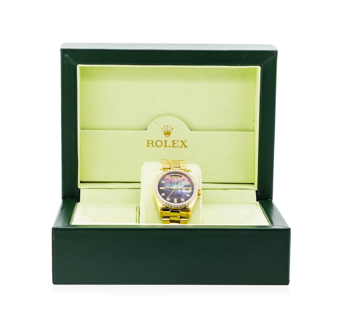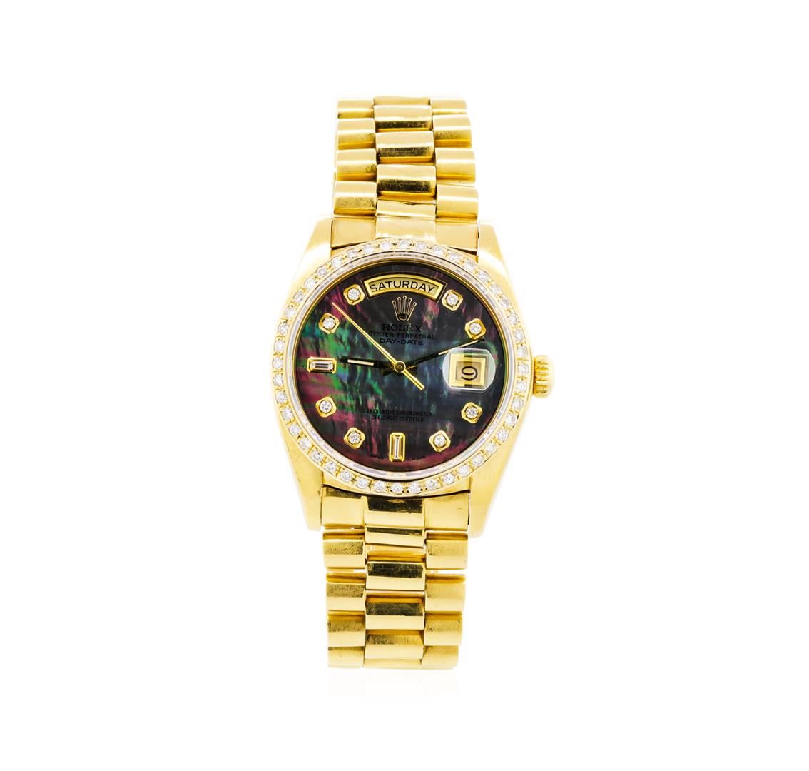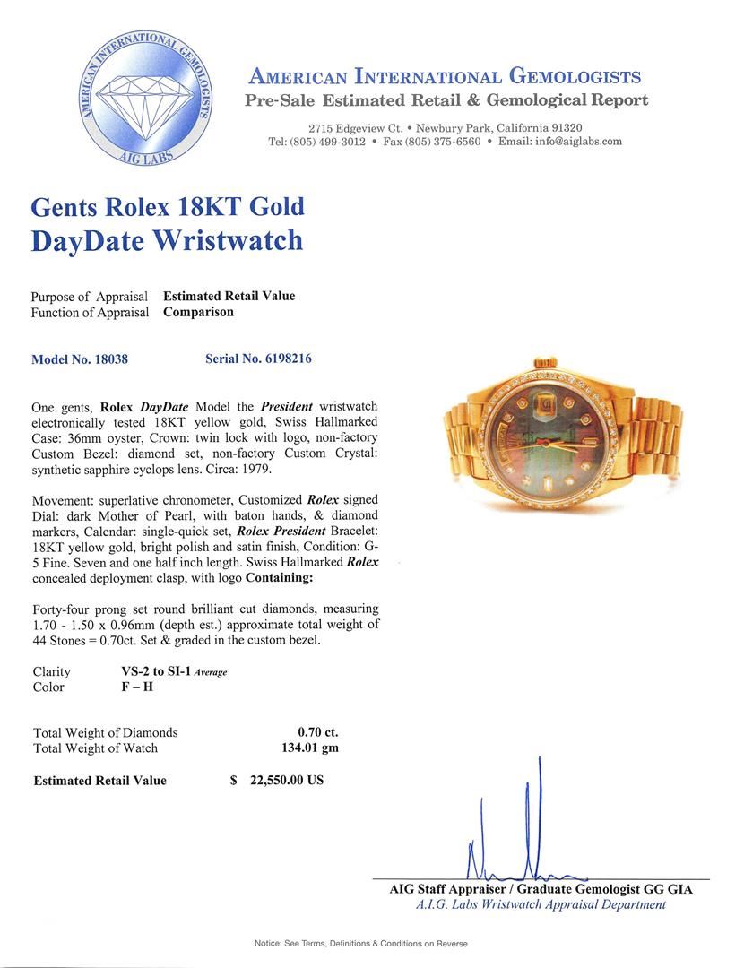 One gents, Rolex DayDate Model the President wristwatch electronically tested 18KT yellow gold, Swiss Hallmarked Case: 36mm oyster, Crown: twin lock with logo, non-factory Custom Bezel: diamond set, non-factory Custom Crystal: synthetic sapphire cyclops lens. Circa: 1979.Movement: superlative chronometer, Customized Rolex signed Dial: dark Mother of Pearl, with baton hands, & diamond markers, Calendar: single-quick set, Rolex President Bracelet: 18KT yellow gold, bright polish and satin finish, Condition: G-5 Fine. Seven and one half inch length. Swiss Hallmarked Rolex concealed deployment clasp, with logo Containing: Forty-four prong set round brilliant cut diamonds, measuring 1.70 - 1.50 x 0.96mm (depth est.) approximate total weight of 44 Stones = 0.70ct. Set & graded in the custom bezel. Clarity: VS-2 to SI-1 Average. Color: F - H. Total Weight of Diamonds 0.70ct. Total Weight of Watch 134.01gm. This watch also comes with Appraisal and Box. AIG Appraised at $22,550.00.