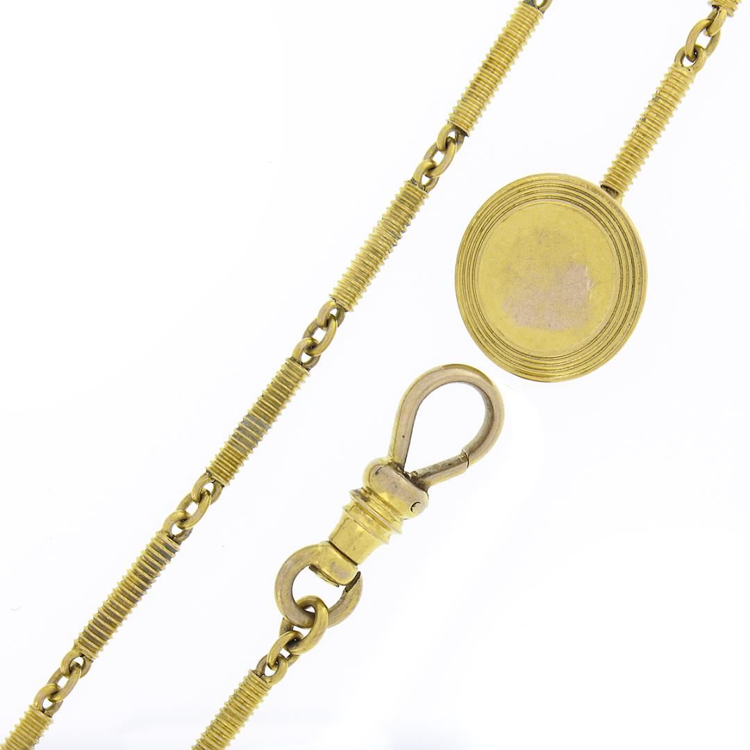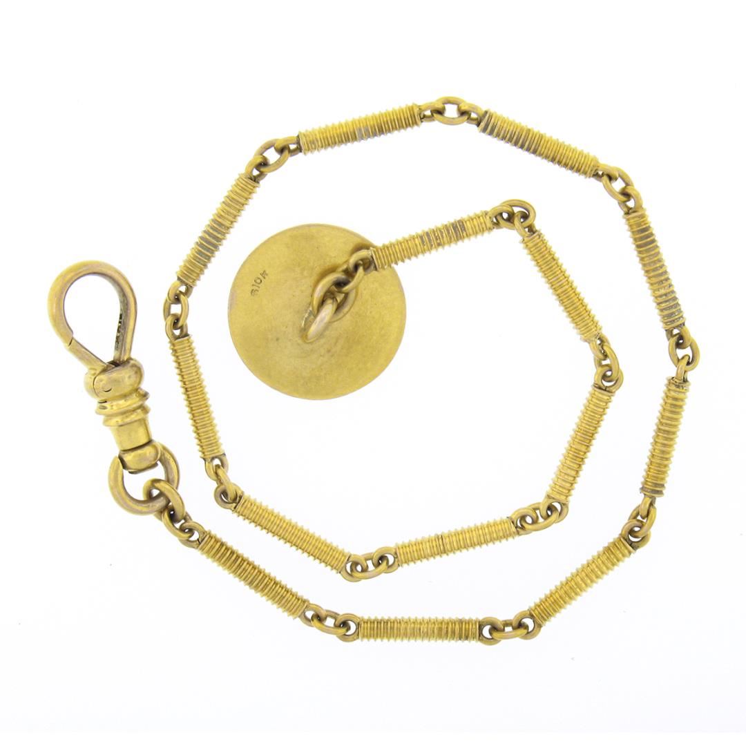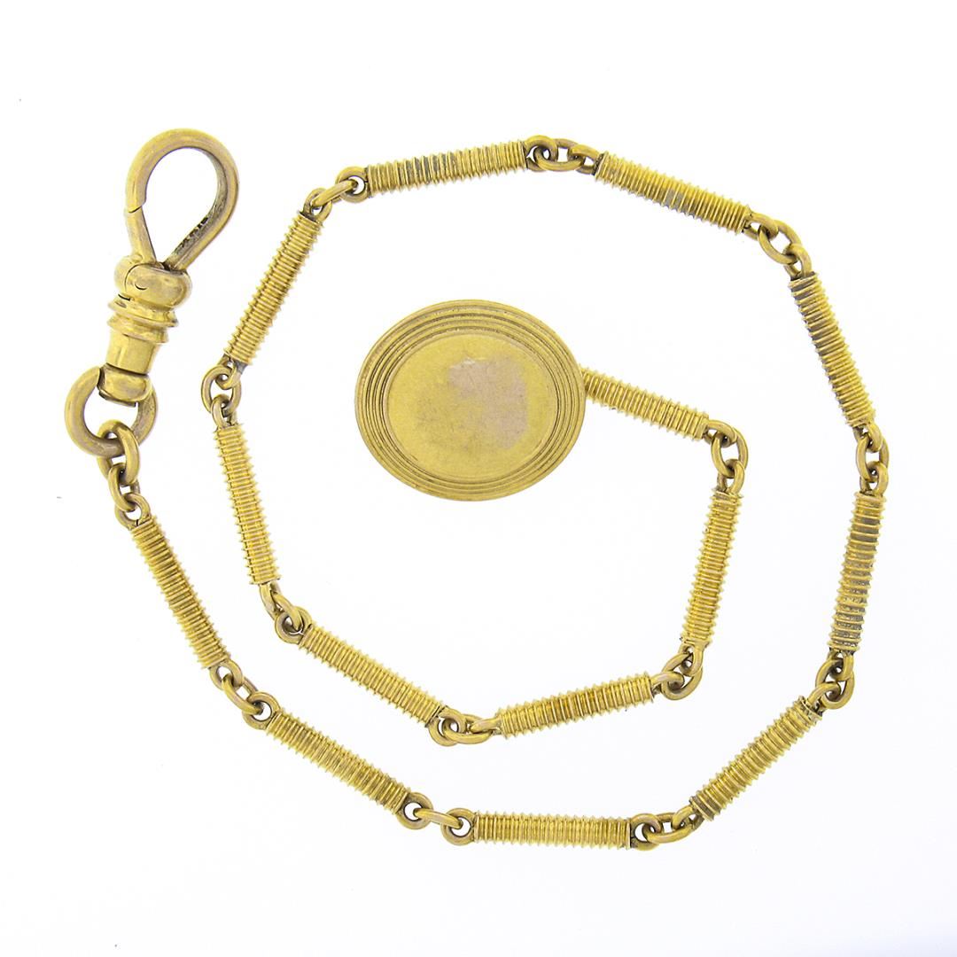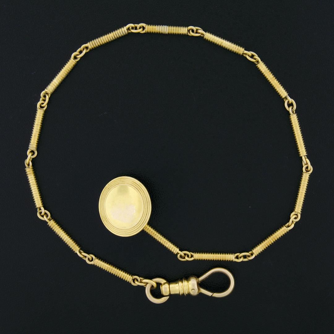An antique solid 12k yellow gold pocket watch chain. It weighs a total of 6.09 grams, measures 2.1mm wide, and measures 9.25 inches in length.