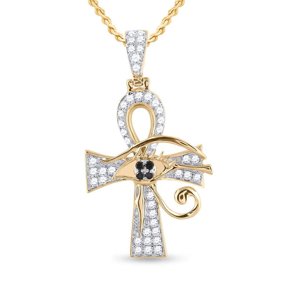10kt Yellow Gold Mens Round Black Color Enhanced Diamond Ankh Cross Charm Pendant 1/2 Cttw