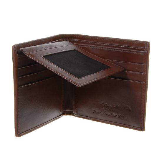 Well made; brand new mens Crocodile Hide wallet. Sought after back skin dyed brown. 4.5" x 4" when folded; multiple card slots; bill slots and license flap inside; $395 retail