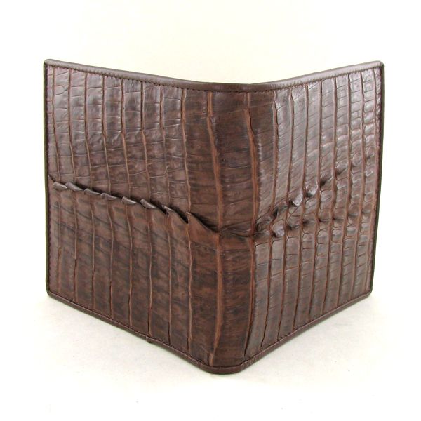 Well made; brand new mens Crocodile Hide wallet. Sought after tail skin dyed brown. 4.25" x 4" when folded; multiple card slots; bill slots and license flap inside