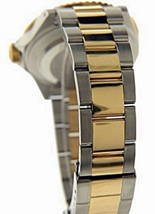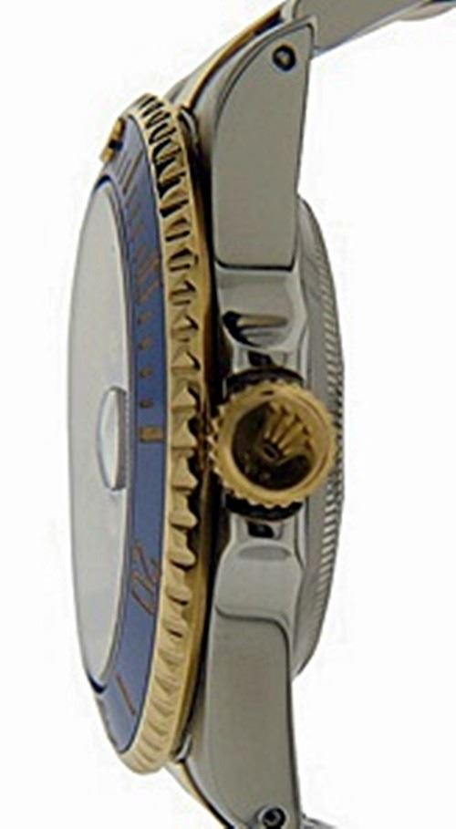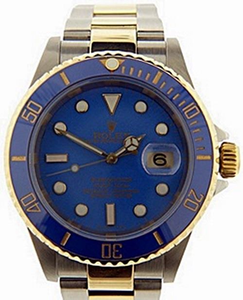 Manufacturer: Rolex , Model Name: Submariner , Model Number: 16613 , Gender: Mens , Circa 2000 , Condition: Pre-Owned Polished and Overhauled, Case: Stainless Steel 40mm Width , Movement: Automatic , Dial: Original Rolex Face Professionally Refinshed to make it look like newer cermaic model , Bezel: Rotable 18K Gold with Aftermarket Blue Ceramic Insert, Crown: 18K Yellow Gold , Bracelet/Strap: Oyster Stainless Steel and Gold fits up to 7 1/2 Inches , Crystal: Sapphire , Calander: Quick-Set Date at Three O'Clock, Box/Papers: Papers
