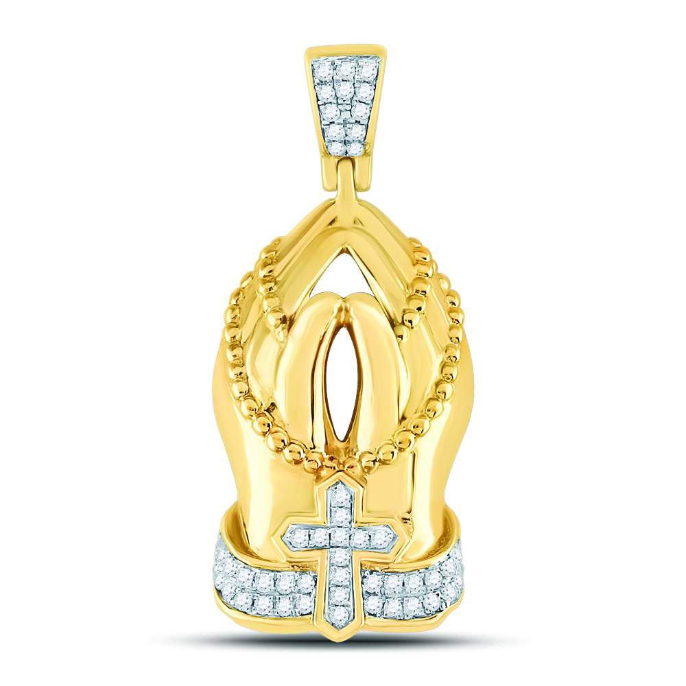 REF-33R6K - SKU: GD118970 ---- Mens Diamond Praying Hands Rosary Charm Pendant 1/4 Cttw 10kt Yellow Gold