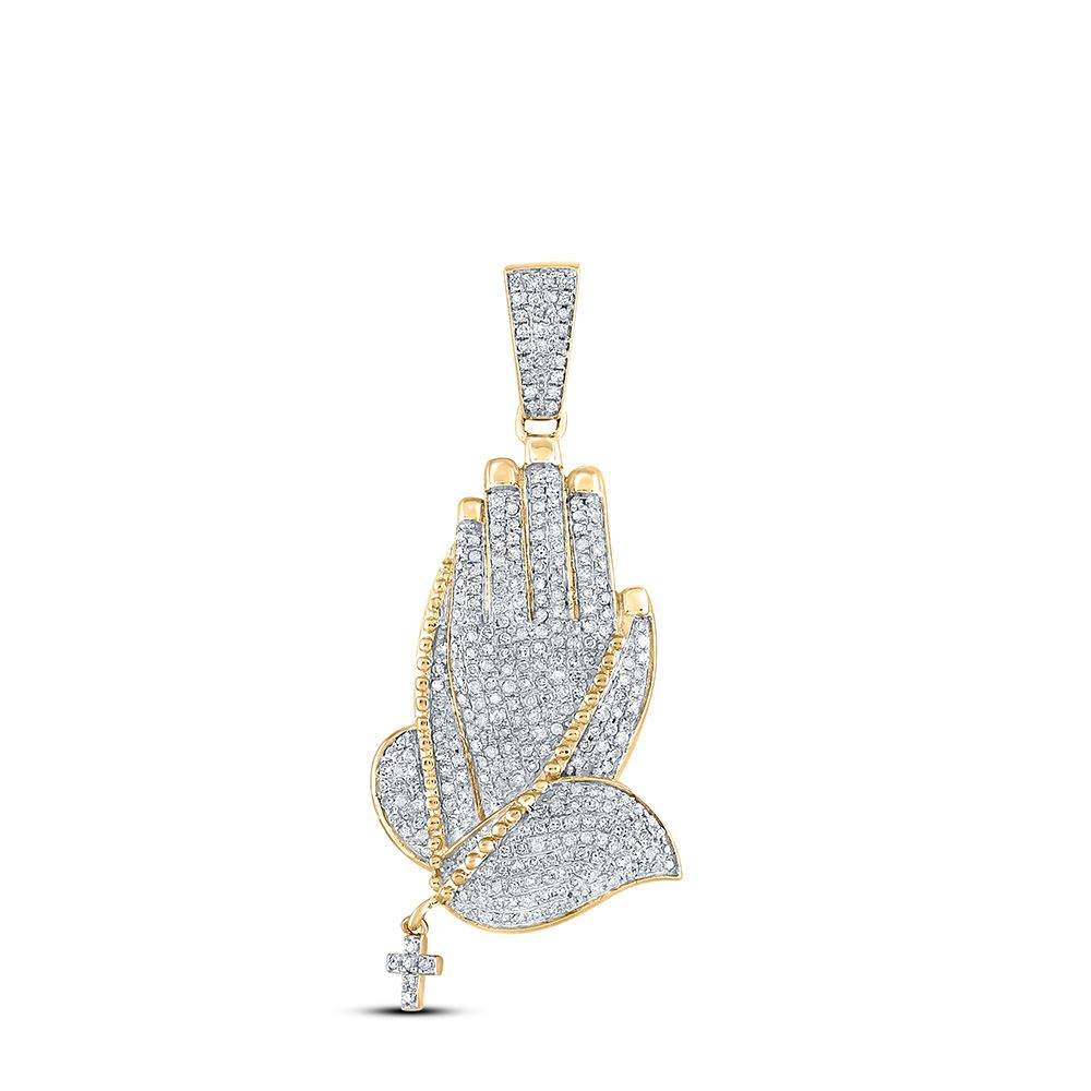 10kt Yellow Gold Mens Round Diamond Praying Hands Rosary Charm Pendant 7/8 Cttw