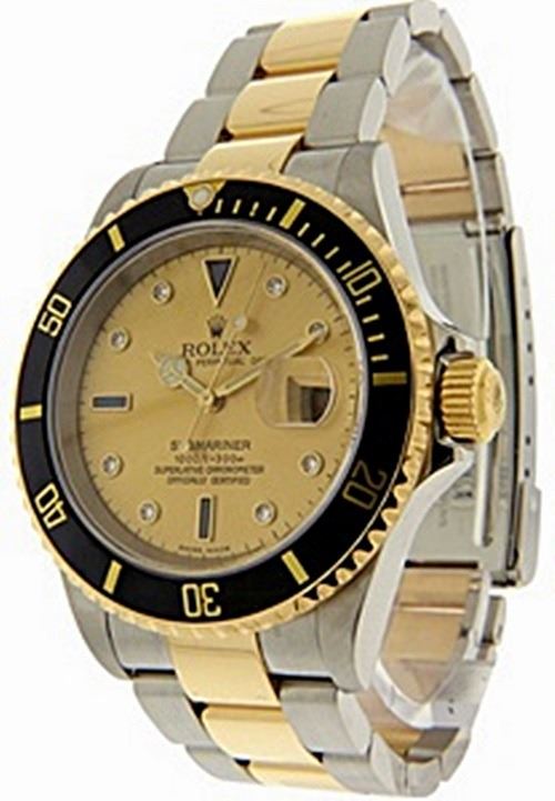 Manufacturer: Rolex , Model Name: Submariner , Model Number: 16613 T , Gender: Mens , Circa 2004 , Condition: Pre-Owned Polished and Overhauled, Case: Stainless Steel 40mm Width , Movement: Automatic , Dial: Original Rolex Serti Gold color Face with Genuine Diamonds and Sapphires , Bezel: Rotable Yellow Gold with Black Insert , Crown: 18K Yellow Gold , Bracelet/Strap: Oyster Stainless Steel and Yellow Gold up to 7 1/2 Inches , Crystal: Sapphire , Calander: Quick-Set Date at Three O'Clock, Box/Papers: Box and Papers