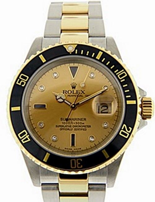 Manufacturer: Rolex , Model Name: Submariner , Model Number: 16613 T , Gender: Mens , Circa 2004 , Condition: Pre-Owned Polished and Overhauled, Case: Stainless Steel 40mm Width , Movement: Automatic , Dial: Original Rolex Serti Gold color Face with Genuine Diamonds and Sapphires , Bezel: Rotable Yellow Gold with Black Insert , Crown: 18K Yellow Gold , Bracelet/Strap: Oyster Stainless Steel and Yellow Gold up to 7 1/2 Inches , Crystal: Sapphire , Calander: Quick-Set Date at Three O'Clock, Box/Papers: Box and Papers
