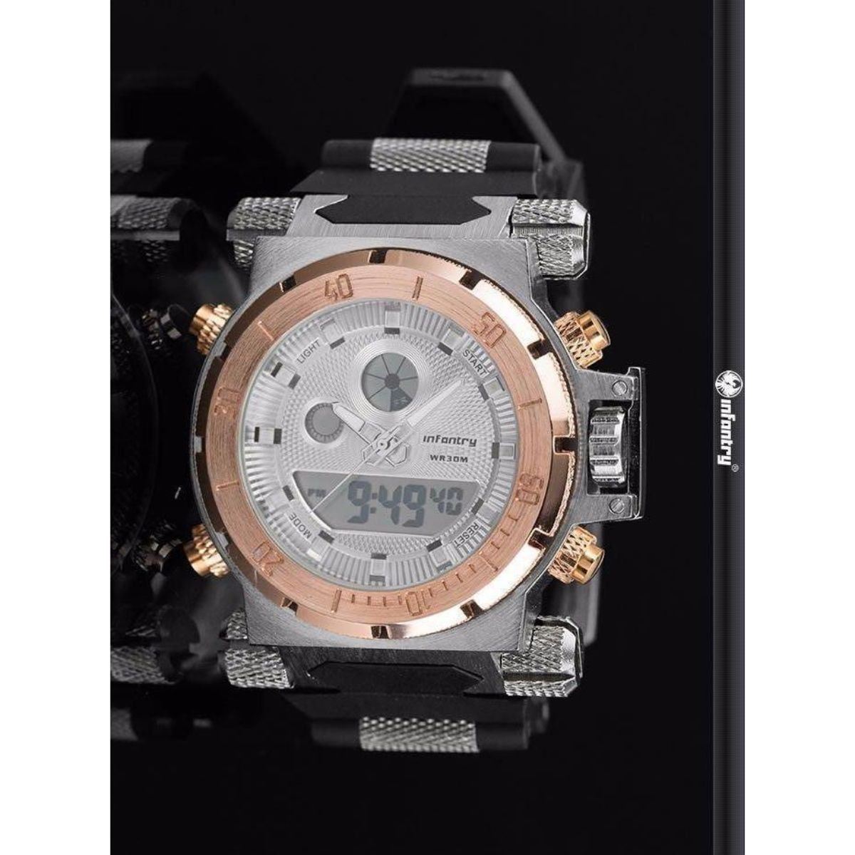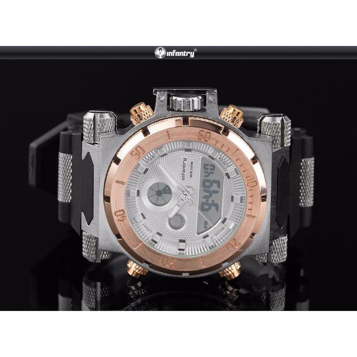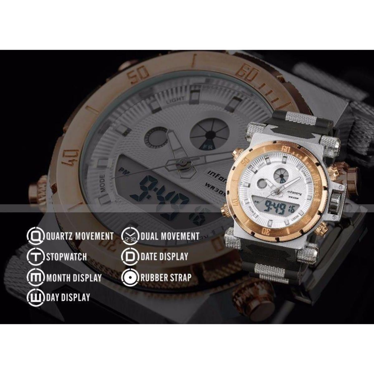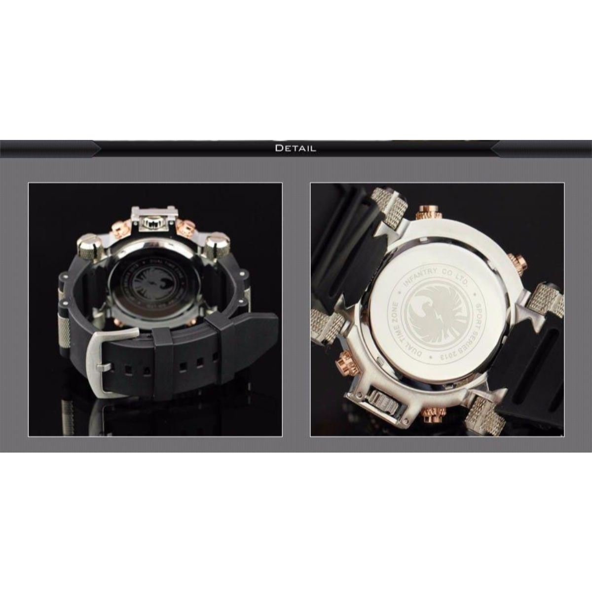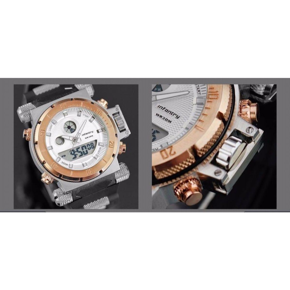 Men's digital quartz sport chronograph wristwatch. Infantry model with 2-piece strap. Army rubber with gold wash. White face & black band. 26mm lug width, 50mm case size, Water Resistance Rating: 30 m ( 3 ATM ). New with tags & paperwork, in original box.