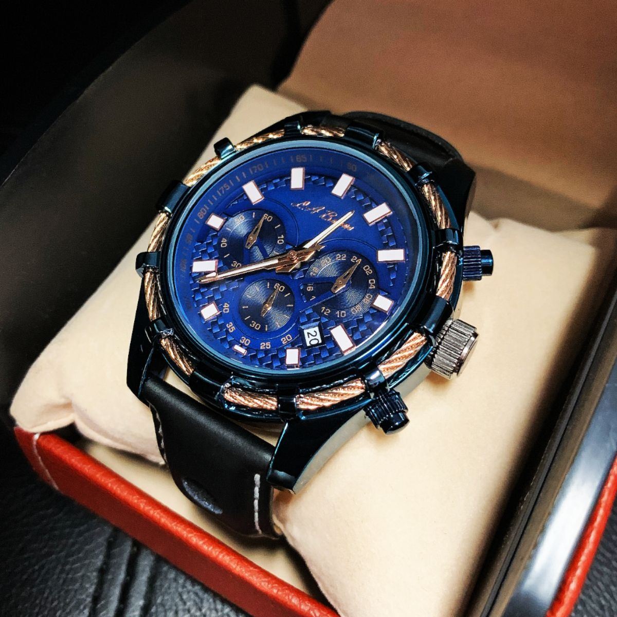 A Men’s LA Banus Rope Bezel Chronograph Watch With Vibrant Blue Shaded Casing. The German Handcrafted Watch Is Sporting A Stitched Genuine Leather Sports Band. A Defined Sportsman Look To A Quality Time Piece & An Excellent Choice For Any Collector. The Watch Is Accompanied By A Mounting Pillow & Stitch Leather Casing From L.A Banus. This Offers Safe Keeping For Your Watch In You Collection. Please View Photos For Further Details.