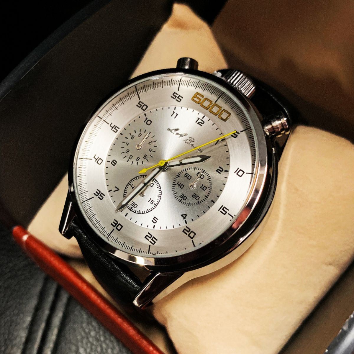 Men’s LA Banus Silver 6000 Edition Chronograph Movement Watch With Genuine Leather Band. A Polished Dial Face Brings Out A Stunning Luxury Look To A Chronograph Watch. German Hand Craftsmanship Is Clear In The Movement Of This TimePiece. The Watch Is Accompanied By A Mounting Pillow & Stitch Leather Casing From L.A Banus. This Offers Safe Keeping For Your Watch In You Collection. Please View Photos For Further Details.