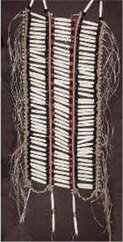 This is a handmade Sturdy Native American Breast plate made from Real bone Hairpipe, brass beads and Glass beads. Each line of hairpipe is individually strung on sinew. Leather ties for the neck and waist. Measures 7" wide and 18" to the bottom of the hairpipe, 22" to the end of the dangle at the bottom.