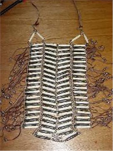 Full Bone Native American Breast Plate Approximate Dimensions: 7" wide by 15" long. White and Brown Bone rows of hairpipe. Each one will vary slightly. Real bone hairpipe, glass beads and brass beads.