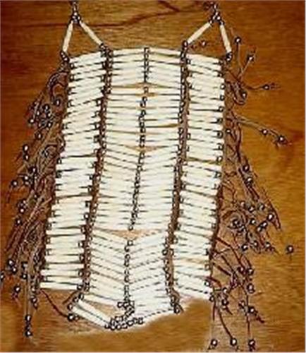 Full Bone Native American Breast Plate Approximate Dimensions: 7" wide by 15" long. White rows of hairpipe. Each one will vary slightly. Real bone hairpipe, glass beads and brass beads.